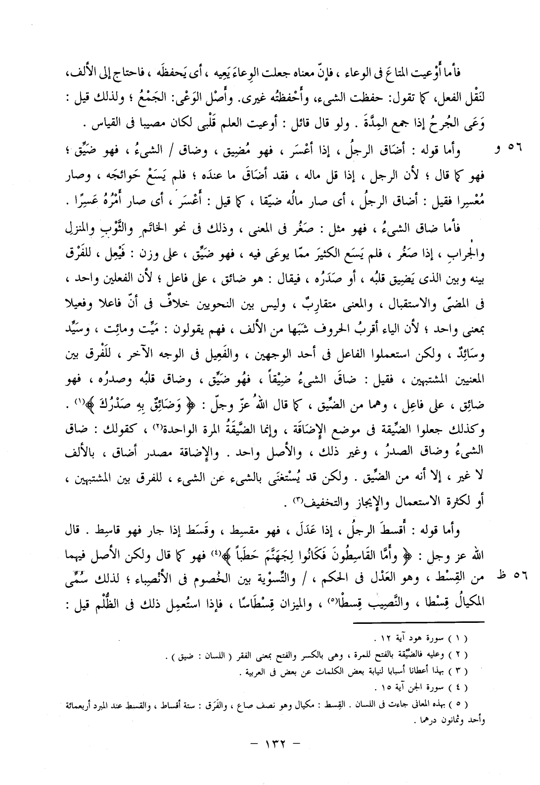 وأما قوله: أقسط الرجل، إذا عدل، فهو مقسط، وقسط إذا جار فهو قاسط. قال الله عز وجل: (وأَمَّا القَاسِطُونَ فَكَانُوا لِجَهَنَّمَ حَطَبًا) فهو كما قال ولكن الأصل فيهما من القسط، وهو العدل في الحكم، / والتسوية بين الخصوم في الأنصباء؛ لذلك سمي المكيال قسطا، والنصيب قسطا، والميزان قسطاساً، فإذا استعمل ذلك في الظلم قيل: