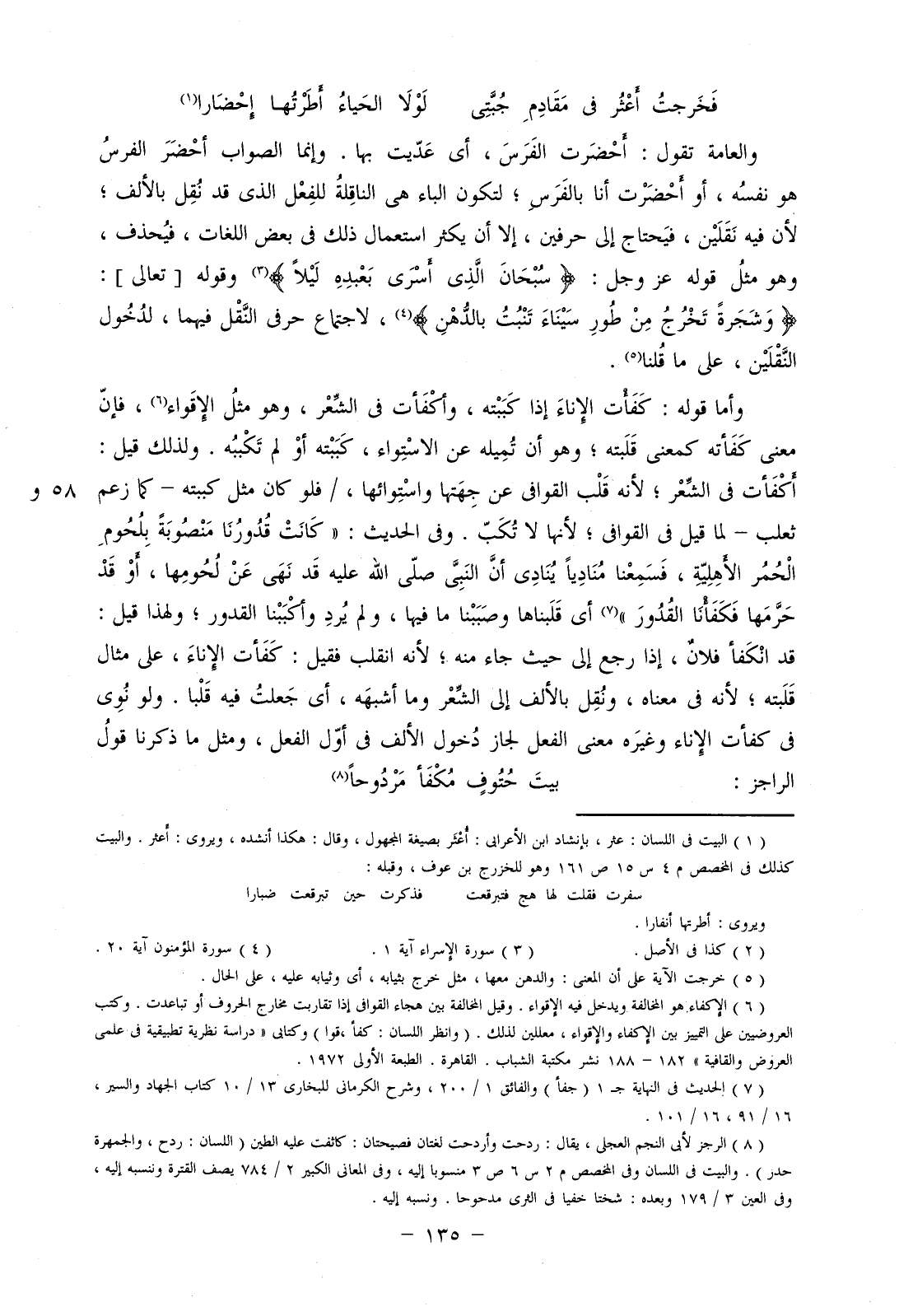 وأما قوله: كفأة الإناء إذا كببته، وأكفأت في الشعر، وهو مثل الإقواء، فإن معنى كفأته كمعنى قلبته؛ وهو أن تميله عن الاستواء، كببته أو لم تكببه. ولذلك قيل: أكفأت في الشعر؛ لأنه قلب القوافي عن جهتها واستوائها، / فلو كان مثل كببته- كما زعم ثعلب- لما قيل في القوافي؛ لأنها لا تكب. وفي الحديث: "كانت قدورنا منصوبة بلحوم الحمر الأهلية، فسمعنا منادياً ينادي أن النبي صلى الله عليه قد نهى عن لحومها، أو قد حرمها فكفأنا القدور" أي قلبناها وصببنا ما فيها، ولم يرد وأكببنا القدور؛ ولهذا قيل: قد انكفأ فلان، إذا رجع إلى حيث جاء منه؛ لأنه انقلب فقيل: كفأت الإناء، على مثل قلبته؛ لأنه في معناه، ونقل بالألف إلى الشعر وما أشبهه، أي جعلت فيه قلبا. ولو نوى في كفأت الإناء وغيره معنى الفعل لجاز دخول الألف في أول الفعل، ومثل ما ذكرنا قول الراجز: