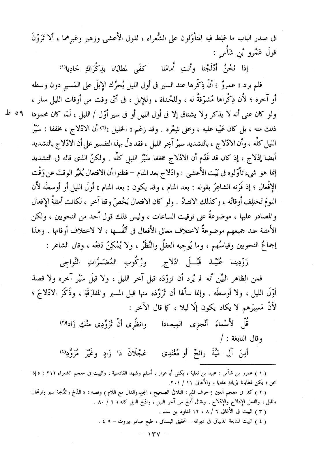 فلم يرد "عمرو" أن ذكرها عند السير في أول الليل يحرك الإبل على المسير دون وسطه أو آخره؛ لأن ذكراها مشوقة له، وللحداة، وللإبل، في أي وقت من أوقات الليل سار، ولو كان عني أنه لا يذكر ولا يشتاق إلا في أول الليل أو في سير أول/ الليل، لما كان محمودا ذلك منه، بل كان عيبا عليه، وعلى شعره. وقد زعم "الخليل" أن الإدلاج، مخففا: سير الليل كله، وأن الادّلاج، بالتشديد سير آخر الليل، فقد دل بهذا التفسير على أن الادّلاج بالتشديد أيضاً إدلاج، إذ كان قد قدم أن الادلاج مخففا سير الليل كله. ولكن الذي قاله في التشديد إنما هو شيء تأولوه في بيت الأعشى: وادّلاج بعد المنام- فظنوا أن الافتعال يغير الوقت عن وقت الإفعال؛ إذ قرنه الشاعر بقوله: بعد المنام، وقد يكون "بعد المنام" أول الليل أو أوسطه لأن النوم تختلف أوقاته، وكذلك الانتباه. ولو كان الافتعال يخص وقتاً آخر، لكانت أمثلة الإفعال والمصادر عليها، موضوعة على توقيت الساعات، وليس ذلك قول أحد من النحويين، ولكن الأمثلة عند جميعهم موضوعة لاختلاف معاني الأفعال في أنفسها، لا لاختلاف أوقاتها. وهذا إجماع النحويين وقياسهم، وما يوجبه العقل والنظر، ولا يمكن دفعه، وقال الشاعر: