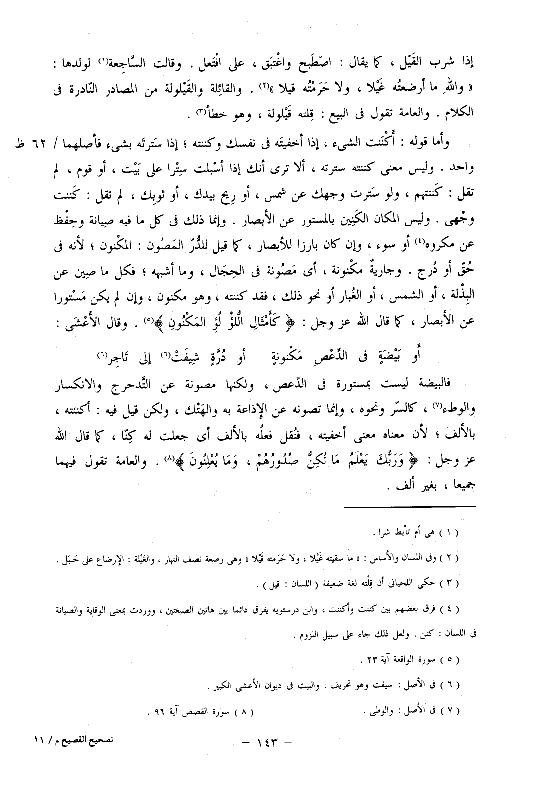 فالبيضة ليست بمستورة في الدعص، ولكنها مصونة عن التدحرج والانكسار والوطء، كالسر ونحوه، وإنما تصونه عن الإذاعة به والهتك، ولكن قيل فيه: أكننته، بالألف؛ لأن معناه معنى أخفيته، فنقل فعله بالألف أي جعلت له كنا، كم قال الله عز وجل: (ورَبُّكَ يَعْلَمُ مَا تُكِنُّ صُدُورُهُمْ ومَا يُعْلِنُونَ). والعامة تقول فيهما جميعاً، بغير ألف.