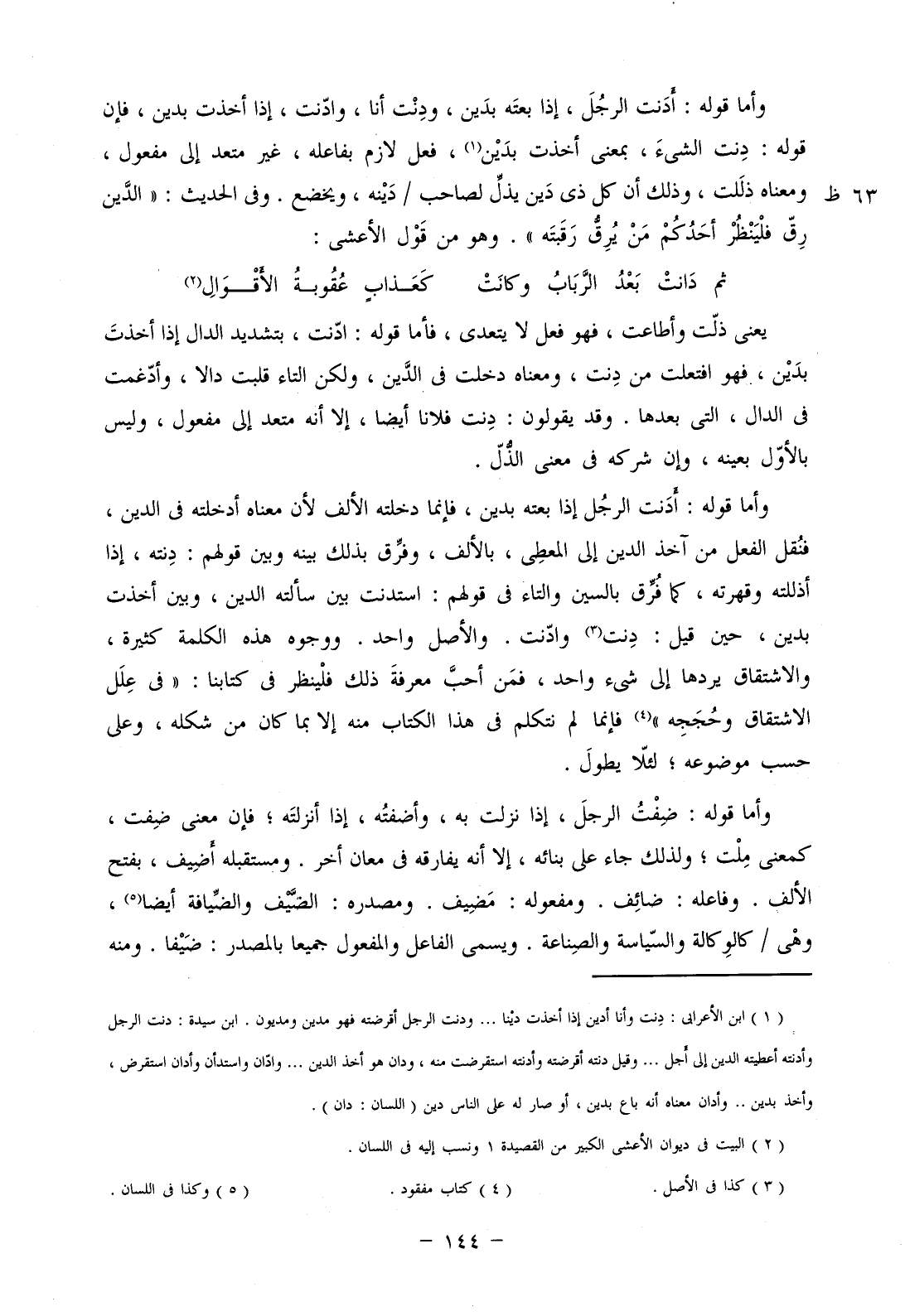 وأما قوله: أدنت الرجل، إذا بعته بدين، ودنت أنا، وادنت، وإذا أخذت بدين، فإن قوله: دنت الشيء، بمعنى أخذت بدين، فعل لازم بفاعله، غير متعد إلى مفعول، ومعناه ذللت، وذلك أن كل ذي دين يذل لصاحب/ دينه، ويخضع. وفي الحديث: "الدين رق فلينظر أحدكم من يرق رقبته". وهو من قول الأعشى: