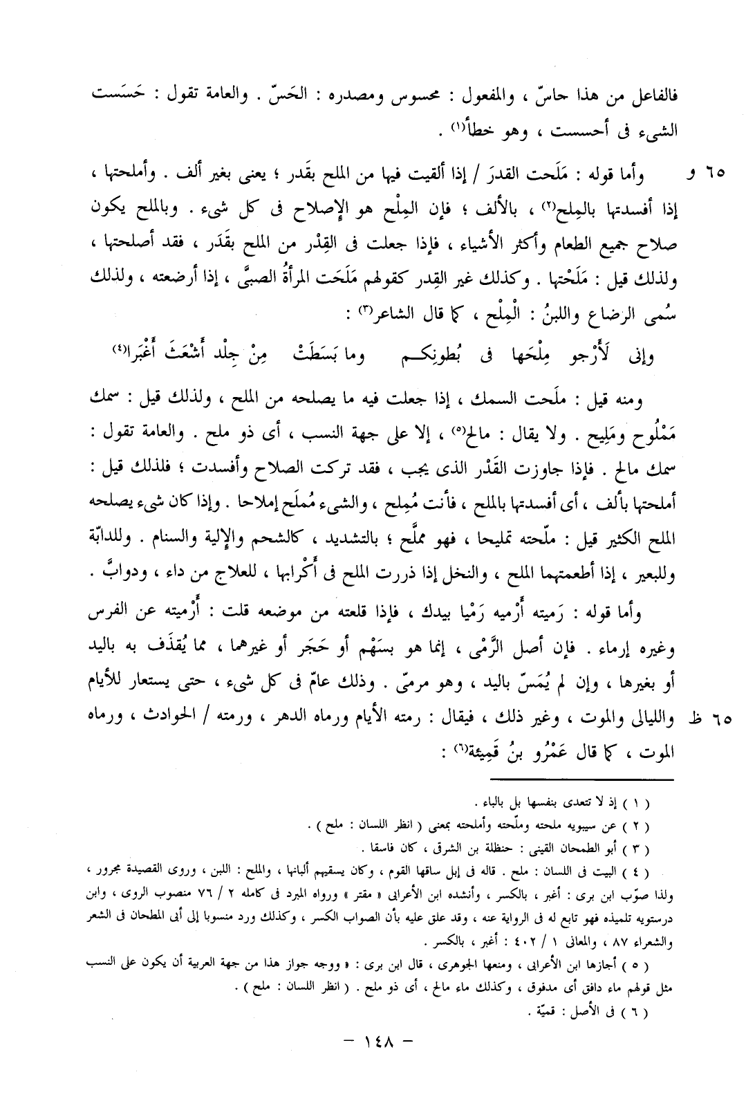 وأما قوله: مَلَحت القدر/ إذاا ألقيت فيها من الملح بقَدر؛ يعني بغير ألف. وأملحتها، إذا أفسدتها بالملح، بالألف؛ فإن الملح هو الإصلاح في كل شيء. وبالملح يكون صلاح جميع الطعام وأكثر الأشياء، فإذا جعلت في القدر من الملح بقَدَر، فقد أصلحتها، ولذلك قيل: ملحتها. وكذلك غير القدر كقولهم ملحت المرأة الصبي، إذا أرضعته، ولذلك سمي الرضاع واللبن: الملح، كما قال الشاعر: