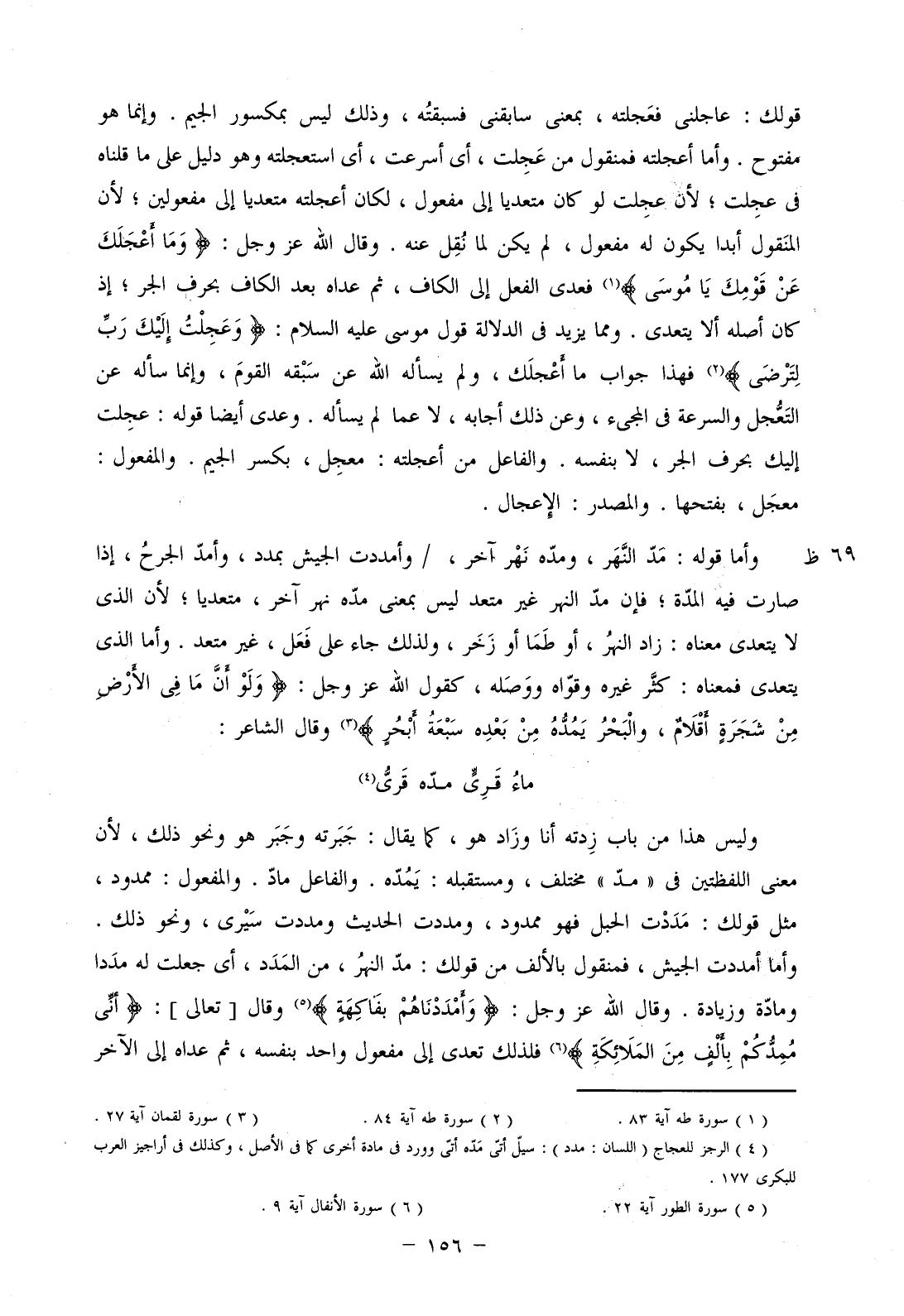 قولك: عاجلني فعجلته، بمعنى سابقني فسبقته، وذلك ليس بمكسور الجيم. وإنما هو مفتوح. وأما أعجلته فمنقول من عجلت، أي أسرعت، أي استعجلته وهو دليل على ما قلناه في عجلت؛ لأن عجلت لو كان متعديا إلى مفعول، لكان أعجلته متعديا إلى مفعولين؛ لأن المنقول أبدا يكون له مفعول، لم يكن لما نقل عنه. وقال الله عز وجل: (ومَا أَعْجَلَكَ عَن قَوْمِكَ يَا مُوسَى) فعدى الفعل إلى الكاف، ثم عداه بعد الكاف بحرف الجر؛ إذ كان أصله ألا يتعدى. ومما يزيد في الدلالة قول موسى عليه السلام: (وعَجِلْتُ إلَيْكَ رَبِّ لِتَرْضَى) فهذا جواب ما أعجلك، ولم يسأله الله عن سبقه القوم، وإنما سأله عن التعجل والسرعة في المجيء، وعن ذلك أجابه، لا عما لم يسأله. وعدى أيضاً قوله: عجلت إليك بحرف الجر، لا بنفسه. والفاعل من أعجلته: معجل، بكسر الجيم. والمفعول: معجل، بفتحها. والمصدر: الإعجال.