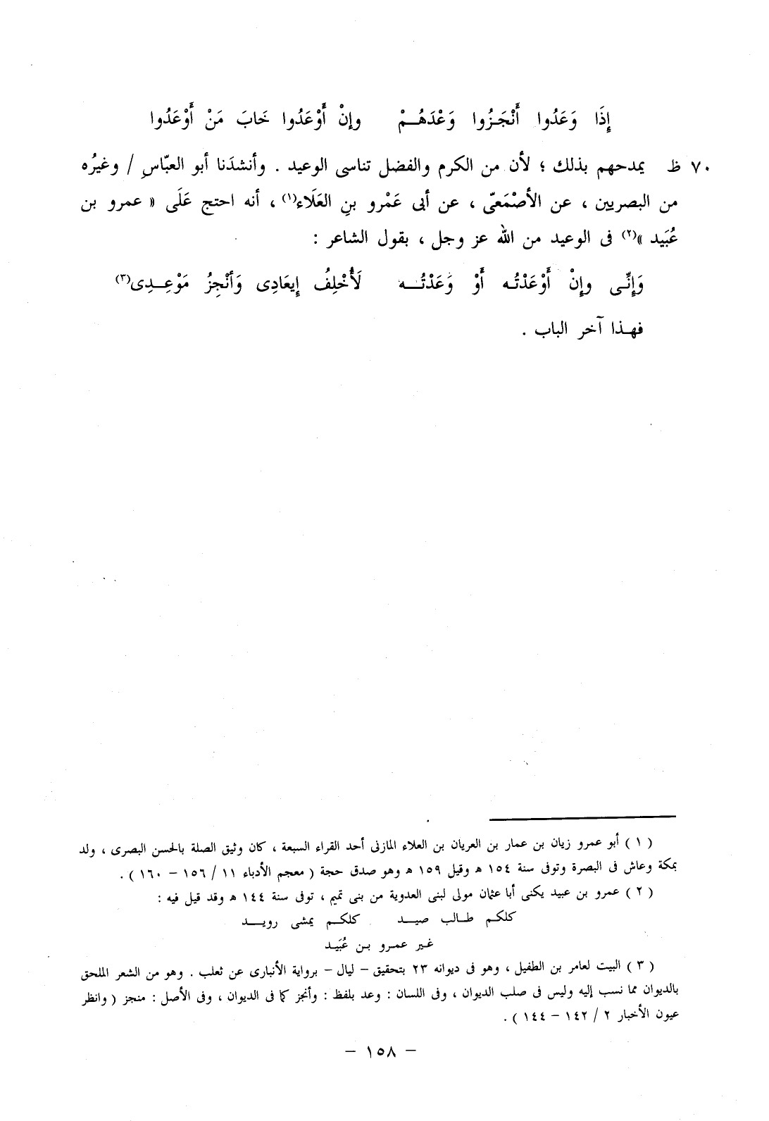 يمدحهم بذلك؛ لأن من الكرم والفضل تناسي الوعيد. وأنشدنا أبو العباس/ وغيره من البصريين، عن الأصمعي، عن أبي عمر بن العلاء، أنه احتاج على "عمرو بن عبيد" في الوعيد من الله عز وجل، بقول الشاعر:
