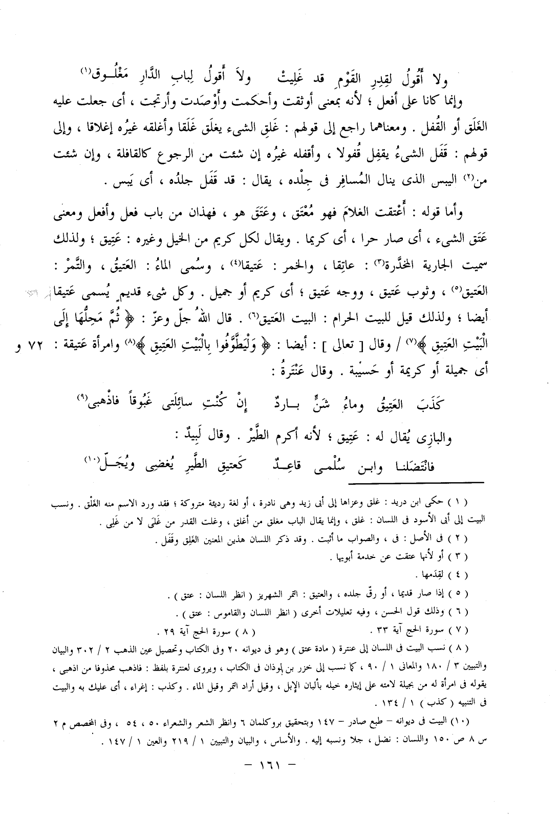 وأما قوله: أعتقت الغلام فهو معتق، وعتق هو، فهذان من باب فعل وأفعل ومعنى عتق الشيء، أي صار حرا، أي كريما، ويقال لكل كريم من الخيل وغيره: عتيق؛ ولذلك سميت الجارية المخدرة: عاتقا، والخمر: عتيقا، وسمي الماء: العتيق، والتمر: العتيق، وثوب عتيق، ووجه عتيق، أي كريم أو جميل. وكل شيء قديم يسمى عتيقا أيضا؛ ولذلك قيل للبيت الحرام: البيت العتيق. قال الله جل وعز: (ثُمَّ مَحِلُّهَا إلَى البَيْتِ العَتِيقِ) / وقال [تعالى]: أيضا: (وَلْيَطَّوَّفُوا بِالْبَيْتِ العَتِيقِ) وامرأة عتيقة: أي جملية أو كريمة أو حسيبة. وقال عنترة: