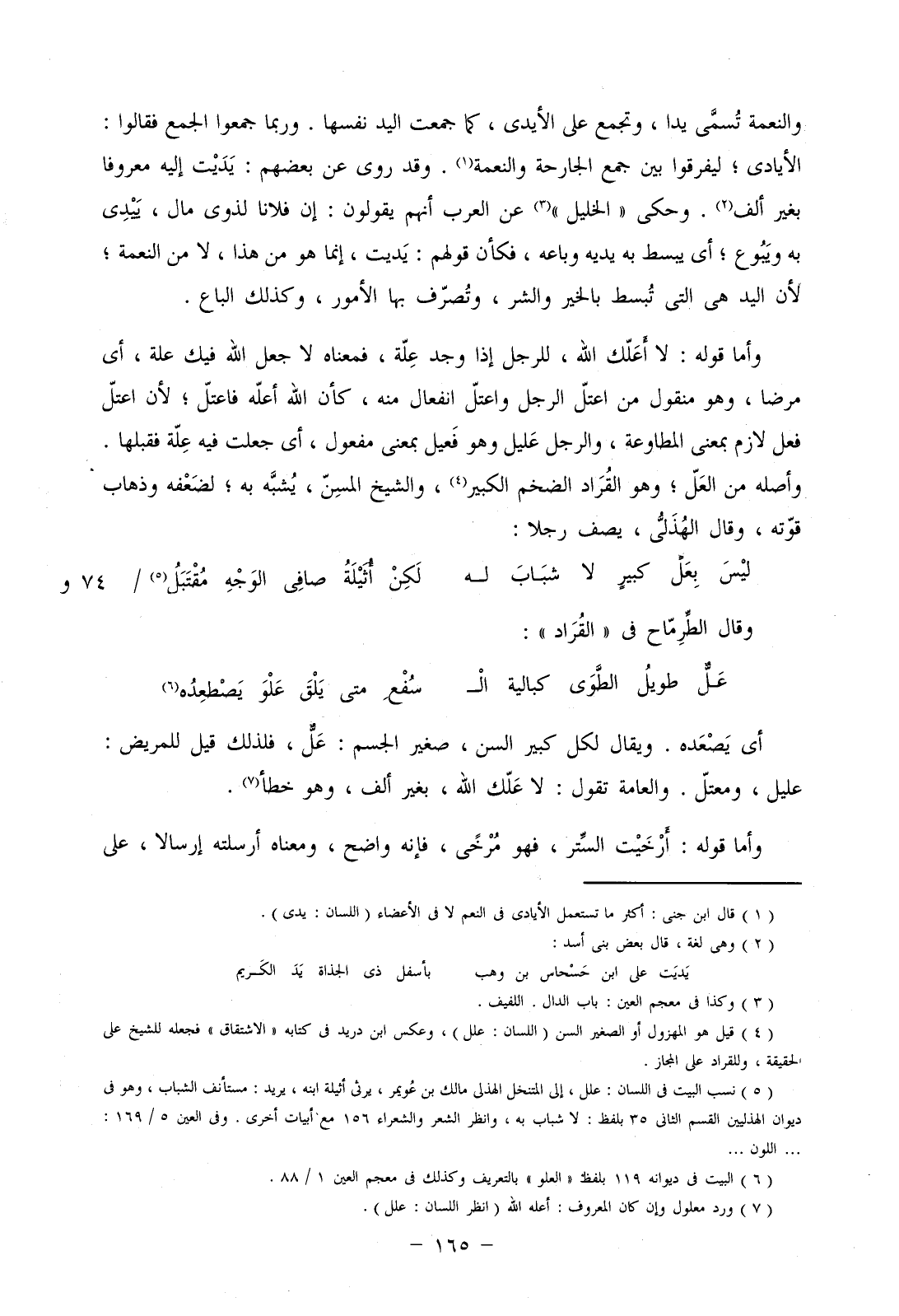 وأما قوله: لا أعلك الله، للرجل إذا وجد علة، فمعناه لا جعل الله فيك علة، أي مرضاً، وهو منقول من اعتل الرجل واعتل انفعال منه، كأن الله أعله فاعتل؛ لأن اعتل فعل لازم بمعنى المطاوعة، والرجل عليل وهو فعيل بمعنى مفعول، أي جعلت فيه علة فقبلها. وأصله من العل؛ وهو القراد الضخم الكبير، والشيخ المسن، يشبه به؛ لضعفه وذهاب قوته، وقال الهذلي، يصف رجلا: