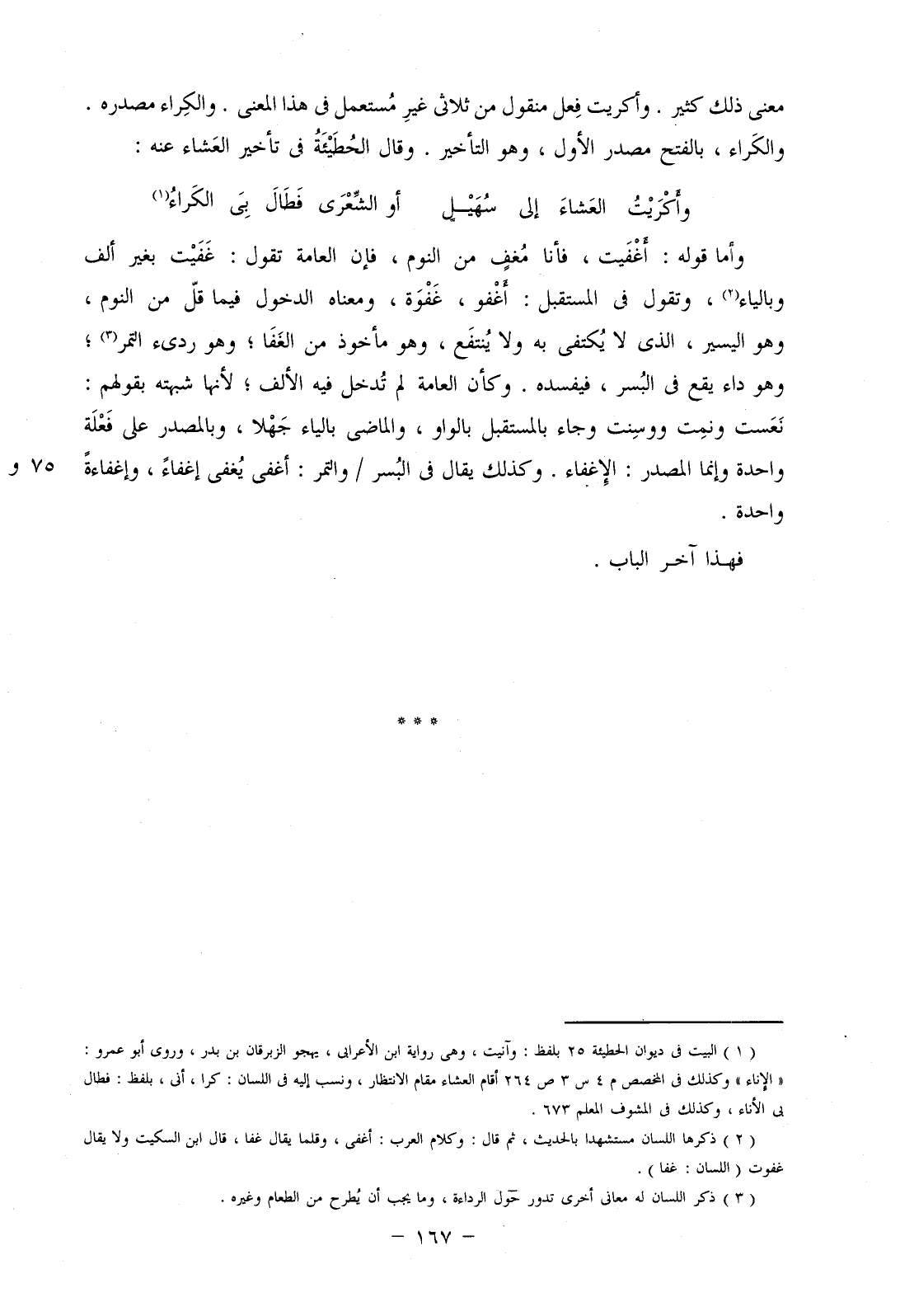 وأما قوله: أَغْفَيت، فأنا مُغف من النوم، فإن العامة تقول: غفيت بغير ألف وبالياء، وتقول في المستقبل: أغفو، غَفوة، ومعناه الدخول فيما قل من النوم، وهو اليسير، الذي لا يكتفى به ولا ينتفع، وهو مأخوذ من الغفا؛ وهو رديء التمر؛ هو داء يقع في البسر، فيفسده، وكأن العامة لم تُدخل في الألف؛ لأنها شبهته بقولهم: نعست ونمت ووسنت وجاء بالمستقبل بالواو، والماضي بالياء جهلا، وبالمصدر على فعلة واحدة وإنما المصدر: الإغفاء. وكذلك يقال في البسر/ والتمر: أغفى يغفي إغفاء، وإغفاءة واحدة.