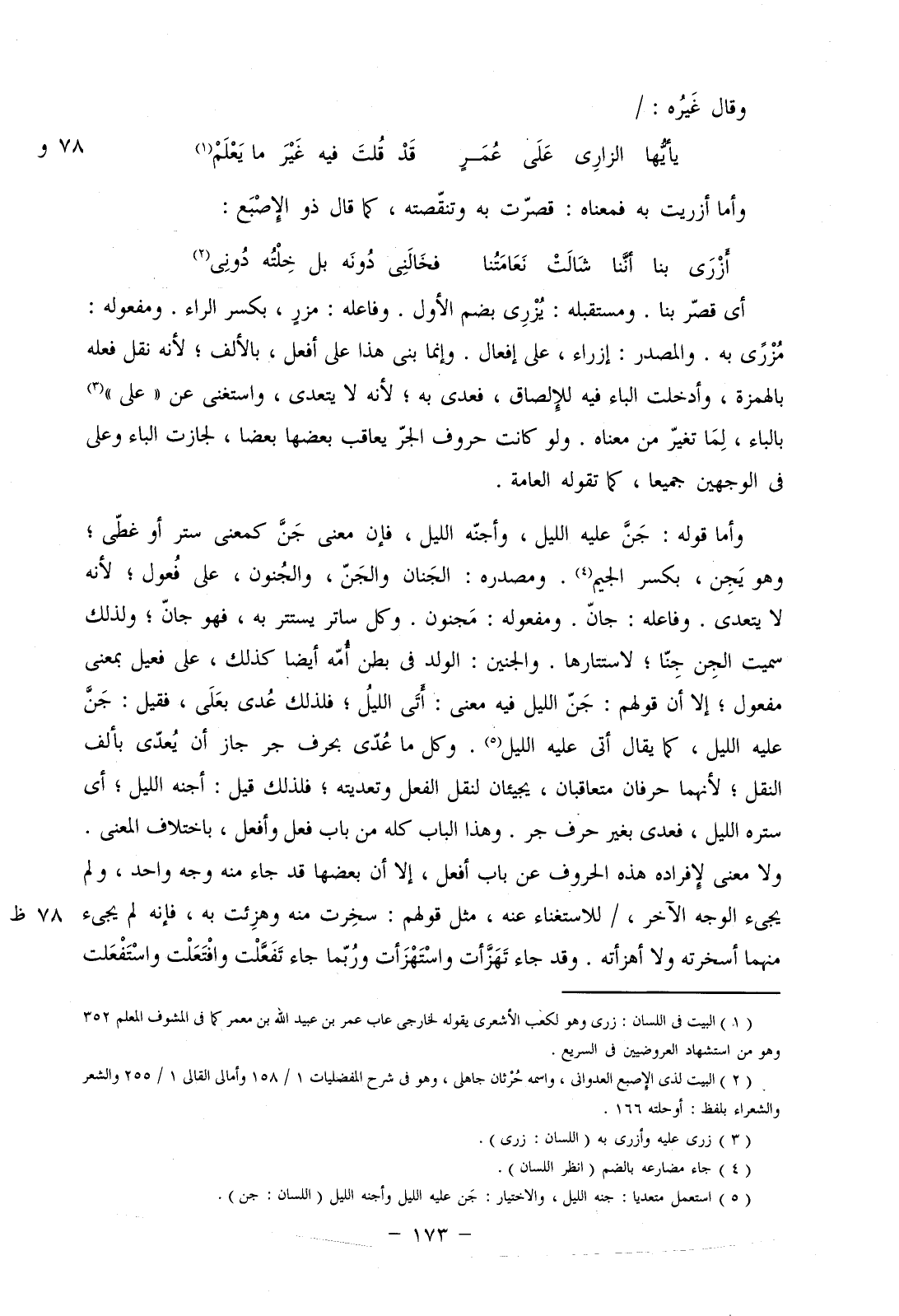 وأما قوله: جن عليه الليل، وأجنه الليل، فإن معنى جن كمعنى ستر أو غطى؛ وهو يجن، بكسر الجيم. ومصدره: الجنان والجن، والجنون، على فعول؛ لأنه لا يتعدى. وفاعله: جان. ومفعوله: مجنون. وكل ساتر يستتر به، فهو جان؛ ولذلك سميت الجن جنا، لاستتارها. والجنين: الولد في بطن أمه أيضا كذلك، على فعيل بمعنى مفعول؛ إلا أن قولهم: جن الليل فيه معنى: أتى الليل؛ فلذلك عدي بعلى، فقيل: جن عليه الليل، كما يقال أتى عليه الليل. وكل ما عدي بحرف جر جاز أن يعدى بألف النقل؛ لأنهما حرفان متعاقبان، يجيئان لنقل الفعل وتعديته؛ فلذلك قيل: أجنه الليل؛ أي ستره الليل، فعدي بغير حرف جر. وهذا الباب كله من باب فعل وأفعل، باختلاف المعنى. ولا معنى لإفراده هذه الحروف عن باب أفعل، إلا أن بعضها قد جاء منه وجه واحد، ولم يجيء الوجه الآخر،/ للاستغناء عنه، مثل قولهم: سخرت منه وهزئت به، فإنه لم يجئ منهما أسخرته ولا أهزأته. وقد جاءت تهزأت واستهزأت وربما جاء تَفَعَّلت وافتَعَلت واستفْعَلت