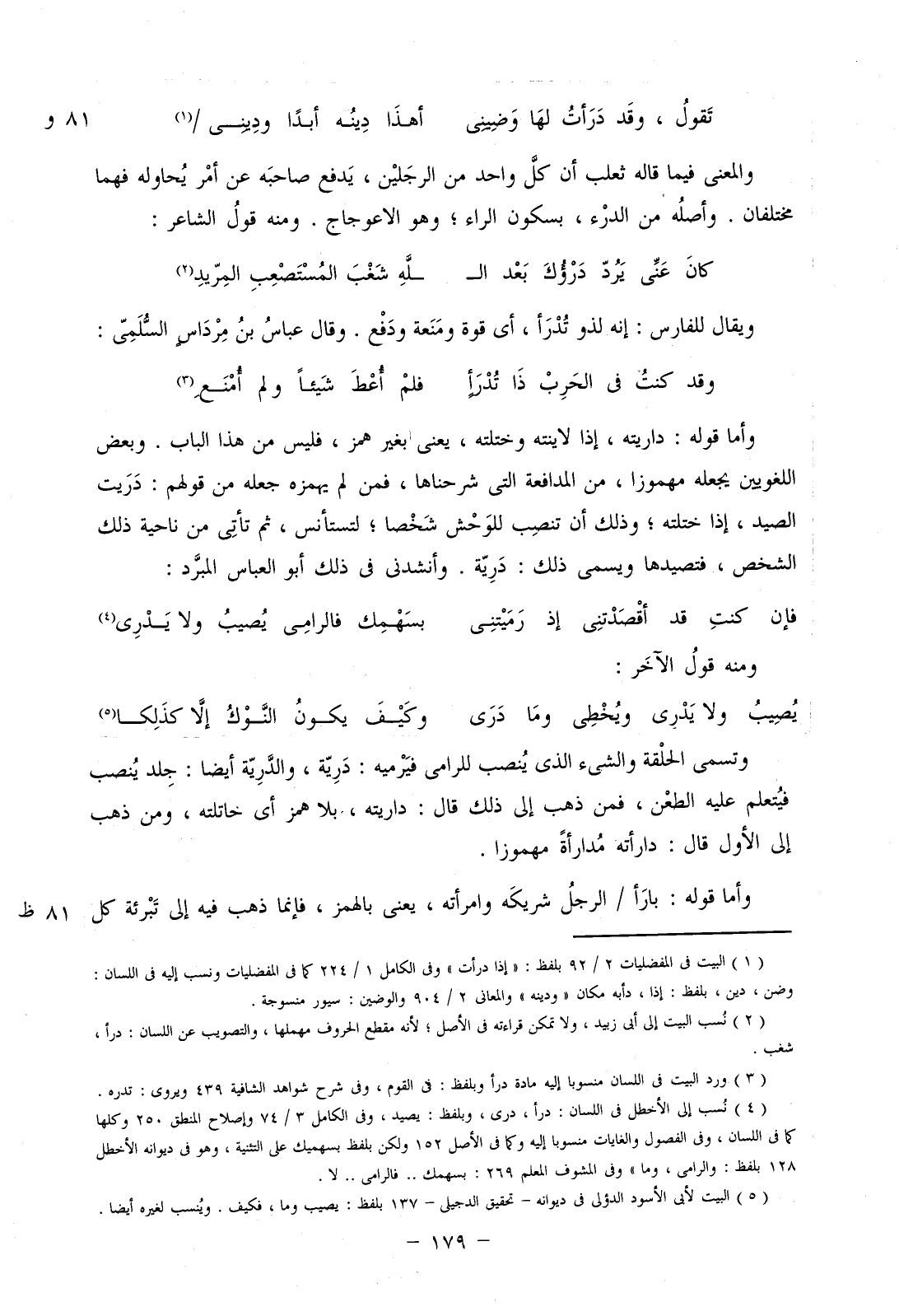 وأما قوله: داريته، إذا لاينته وختلته، يعني بغير همز، فليس من هذا الباب. وبعض اللغويين يجعله مهموزا، من المدافعة التي شرحناها، فمن لم يهمزه جعله من قولهم: دريت الصيد، إذا ختلته؛ وذلك أن تنصب للوحش شخصا؛ لتستأنس، ثم تأتي من ناحية ذلك الشخص، فتصيدها ويسمى ذلك: درية. وأنشدني في ذلك أبو العباس المبرد: