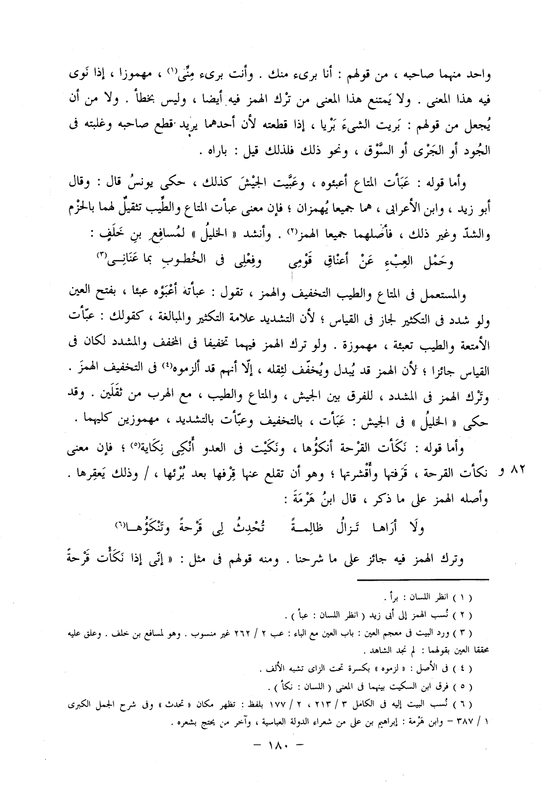 وأما قوله: عبأت المتاع أعبئوه، وعبيت الجيش كذلك، حكى يونس قال: وقال أبو زيد، وابن الأعرابي، هما جميعا يهمزان؛ فإن معنى عبأت المتاع والطيب تثقيل لهما بالحزم والشد وغير ذلك، فأصلهما جميعا الهمز. وأنشد "الخليل" لمسافع بن خلف: