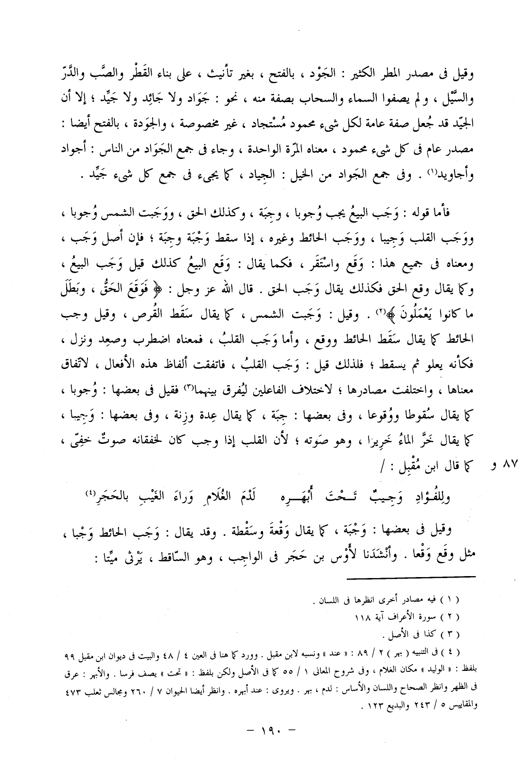 فأما قوله: وجب البيع يجب وجوبا، وجبة، وكذلك الحق، ووجبت الشمس وجوبا، ووجب القلب وجيبا، ووجب الحائط وغيره، إذا سقط وجبة وجبة؛ فإن أصل وجب، ومعناه في جميع هذا: وقع واستقر، فكما يقال: وقع البيع كذلك قيل وجب البيع، وكما يقال وقع الحق فكذلك يقال وجب الحق. قال الله عز وجل: (فَوَقَعَ الحَقُّ وبَطَلَ مَا كَانُوا يَعْمَلُون). وقيل: وجبت الشمس، كما يقال سقط القرص، وقيل وجب الحائط كما يقال سقط الحائط ووقع، وأما وجب القلب، فمعناه اضطرب وصعد ونزل، فكأنه يعلو ثم يسقط؛ فلذلك قيل: وجب القلب، فاتفقت ألفاظ هذه الأفعال، لاتفاق معناها، واختلفت مصادرها؛ لاختلاف الفاعلين ليفرق بينهما فقيل في بعضها وجوبا، كما يقال سقوطا ووقوعا، وفي بعضها: جبة، كما يقال عدة وزنة، وفي بعضها: وجيبا، كما يقال خر الماء خريرا، وهو صوته؛ لأن القلب إذ وجب كان لخفقانه صوت خفي، كما قال ابن مقبل:/