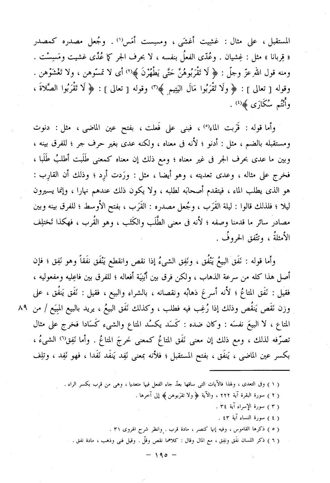 المستقبل، على مثال: غشيت أغشى، ومسست أمس. وجعل مصدره كمصدر "قربانا" مثل: غشيان. وعدي الفعل بنفسه، لا بحرف الجر كما عدي غشيت ومسست. ومنه قول الله عز وجل: (لا تَقْرَبُوهُنَّ حَتَّى يَطْهُرْنَ) أي لا تمسهوهن، ولا تغشوهن. وقوله [تعالى]: (ولا تَقْرَبُوا مَالَ اليَتِيمِ) وقوله [تعالى]: (لا تَقْرَبُوا الصَّلاةَ وأَنتُمْ سُكَارَى).