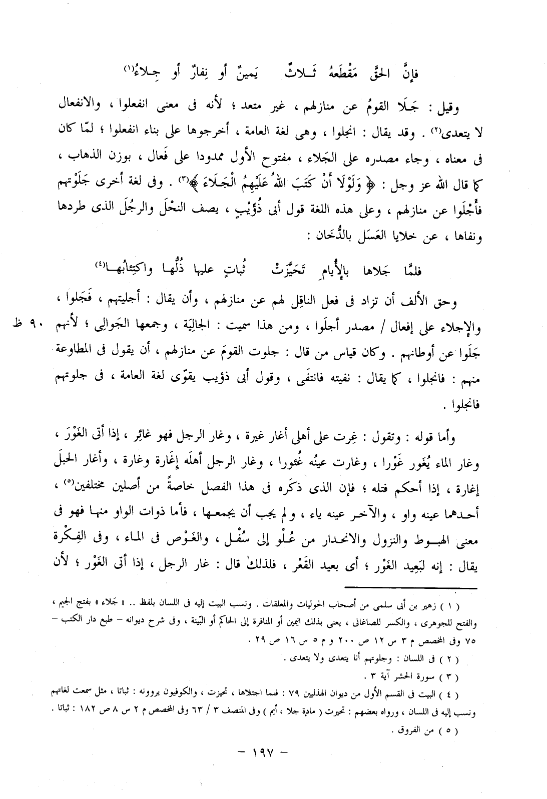 وحق الألف أن تزاد في فعل الناقل لهم عن منازلهم، وأن يقال: أجليتهم، فجلوا، والإجلاء على إفعال/ مصدر أجلوا، ومن هذا سميت: الجالية، وجمعها الجوالي: لأنهم جلوا عن أوطانهم. وكان قياس من قال: جلوت القوم عن منازلهم، أن يقول في المطاوعة منهم: فانجلوا، كما يقال: نفيته فانتفى، وقول أبي ذؤيب يقوي لغة العامة، في جلوتهم فانجلوا.