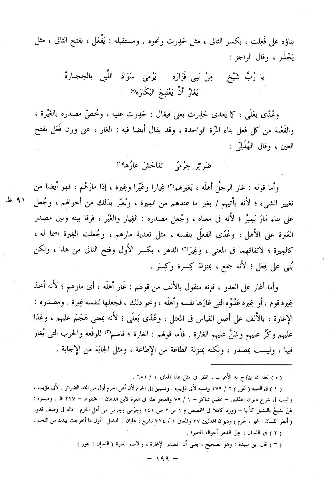 وعدي بعلى، كما يعدى حذرت بعلى فيقال: حذرت عليه، وخص مصدره بالغيرة، والفعلة من كل فعل بناء المرة الواحدة، وقد يقال أيضا فيه: الغار، على وزن فعل بفتح العين، وقال الهذلي: