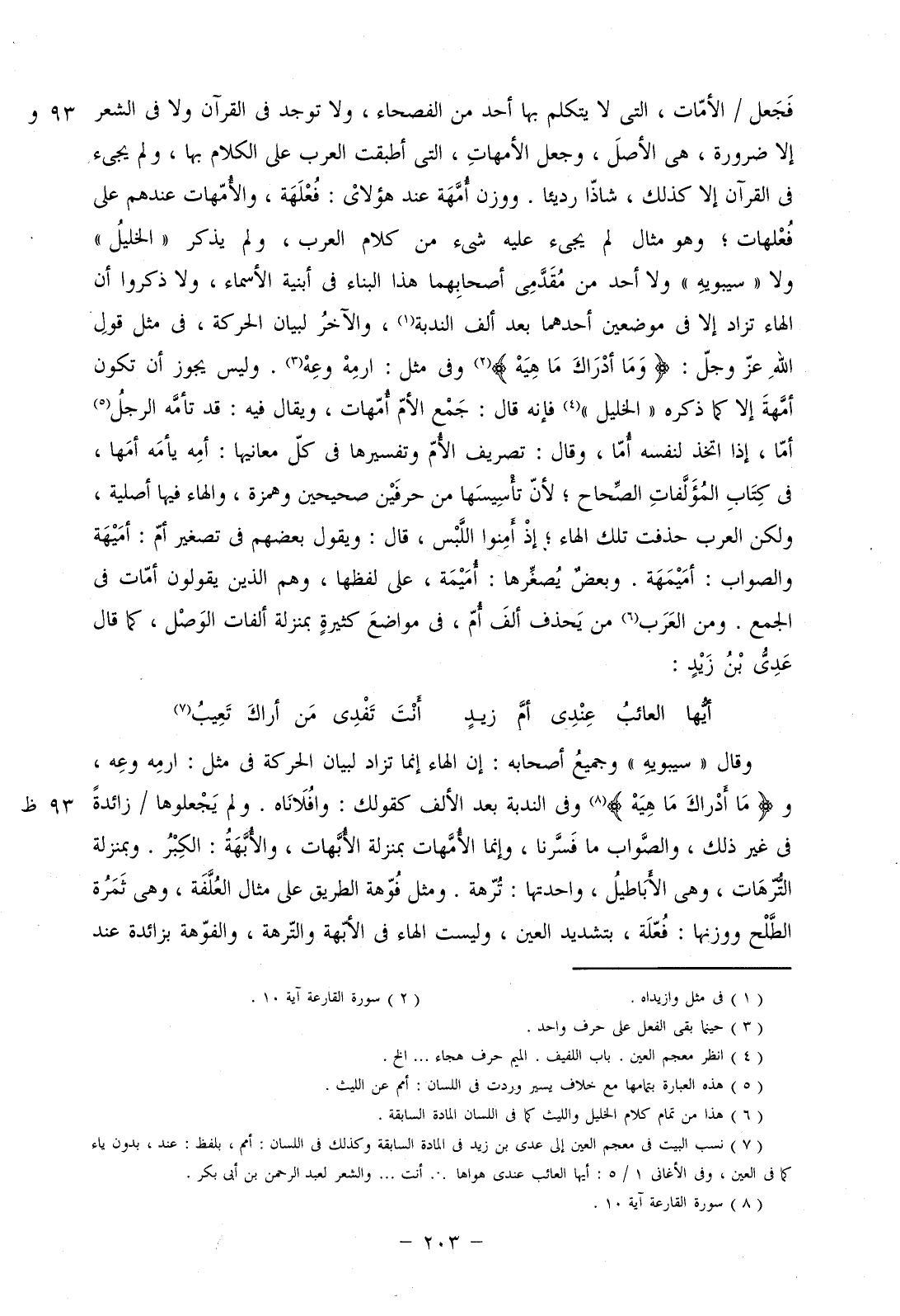 فجعل / الأمات، التي لا يتكلم بها أحد من الفصحاء، ولا توجد في القرآن ولا في الشعر إلا ضرورة، هي الأصل، وجعل الأمهات، التي أطبقت العرب على الكلام بها، ولم يجئ في القرآن إلا كذلك، شاذا رديئا. ووزن أمهة عند هؤلاي: فعلهة، والأمهات عندهم على فعلهات؛ وهو مثال لم يجئ عليه شيء من كلام العرب، ولم يذكر "الخليل" ولا "سيبويه" ولا أحد من مقدمي أصحابهما هذا البناء في أبنية الأسماء، ولا ذكروا أن الهاء تزاد إلا في موضعين أحدهما بعد ألف الندبة، والآخر لبيان الحركة في مثل قول الله عز وجل: (ومَا أَدْرَاكَ مَاهِيَهْ) وفي مقل: ارمه وعه. وليس يجوز أن تكون أمهة إلا كما ذكره "الخليل" فإنه قال: جمع الأم أمهات، ويقال فيه: قد تأمه الرجل أما، إذا اتخذ لنفسه أما، وقال: تصريف الأم وتفسيرها في كل معانيها: أمه يأمه أمها، في كتاب المؤلفات الصحاح؛ لن تأسيسها من حرفين صحيحين وهمزة، والهاء في أصلية، ولكن العرب حذفت تلك الهاء؛ إذ أمنوا اللبس، قال: ويقول بعضهم في تصغير أم: أميهة والصواب: أميمهة. وبعض يصغرها: أميمة، على لفظها، وهم الذين يقولون أمات في الجمع. ومن العرب من يحذف ألف أم، في مواضع كثيرة بمنزلة ألفات الوصل، كما قال عدي بن زيد: