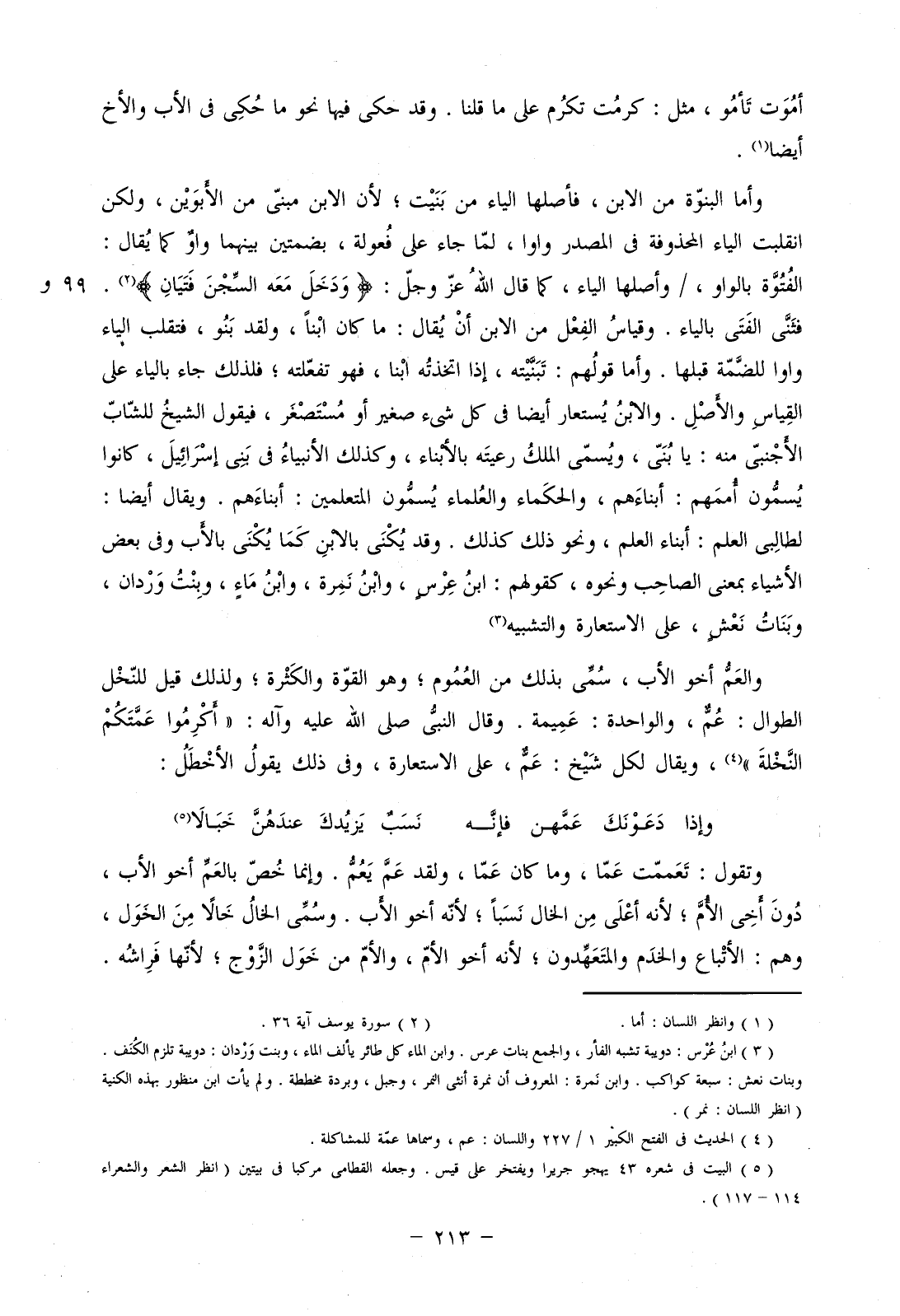 وأما البنوة من الابن، فأصلها الياء من بنيت؛ لأن الابن مبنى من الأبوين، ولكن انقلبت الياء المحذوفة في المصدر واوا، لما جاء على فعولة، بضمتين بينهما واو كما يقال: الفتوة بالواو، /وأصلها الياء، كما قال الله عز وجل: (ودَخَلَ مَعَهُ السِّجْنَ فَتَيَانِ). فثنى الفتى بالياء. وقياس الفعل من الابن أن يقال: ما كان ابنا، ولقد بنو، فتقلب الياء واوا للضمة قبلها. وأما قولهم: تبنيته، إذا اتخذته أبنا، فهو تفعلته؛ فلذلك جاء بالياء على القياس والأصل. والابن يستعار أيضا في كل شيء صغير أو مستصغر، فيقول الشيخ للشاب الأجنبي منه: يا بني، ويسمى الملك رعيته بالأبناء، وكذلك الأنبياء في بني إسرائيل، كانوا يسمون أممهم: أبناءهم، والحكماء والعلماء يسمون المتعلمين: أبناءهم. ويقال أيضا: لطالبي العلم: أبناء العلم، ونحو ذلك كذلك. وقد يكنى بالابن كما يكنى بالأب وفي بعض الأشياء بمعنى الصاحب ونحوه، كقولهم: ابن عِرْس، وابن نمرة، وابن ماء، وبنت وردان، وبنات نعش، على الاستعارة والتشبيه.