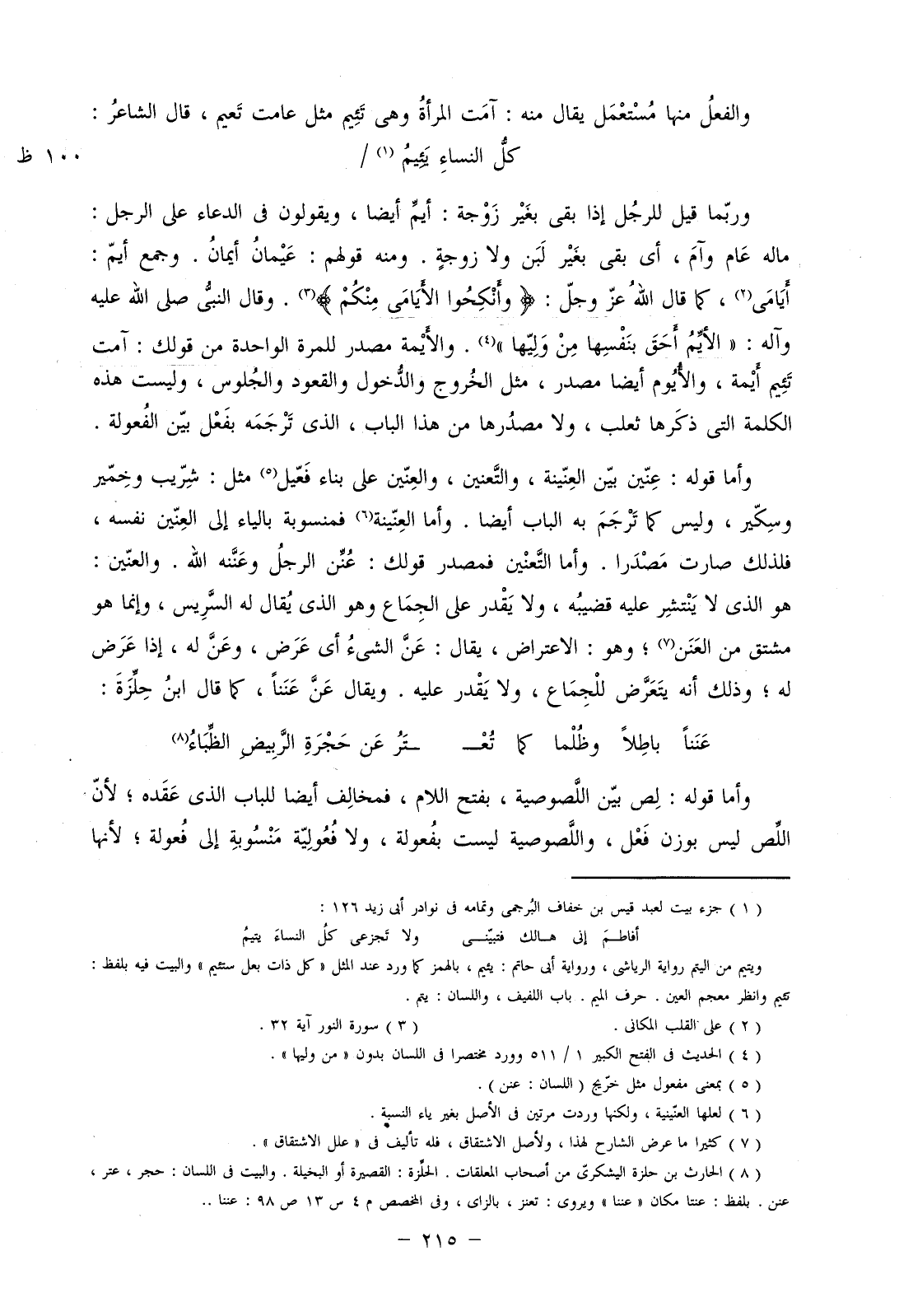 وربما قيل للرجل إذا بقي بغير زوجة: أيم أيضا، ويقولون في الدعاء على الرجل: ماله عام وآم، أي بقي بغير لبن ولا زوجة. ومنه قولهم: عيمان أيمان. وجمع أيم: أيامى، كما قال الله عز وجل: (وأَنكِحُوا الأَيَامَى مِنكُمْ). وقال النبي صلى الله عليه وآله: "الأيم أحق بنفسها من وليها". والأيمة مصدر للمرة الواحدة من قولك: آمت تئيم أيمة، والأيوم أيضا مصدر، مثل الخروج والدخول والقعود والجلوس، وليست هذه الكلمة التي ذكرها ثعلب، ولا مصدرها من هذا الباب، الذي ترجمه بفعل بين الفعولة.