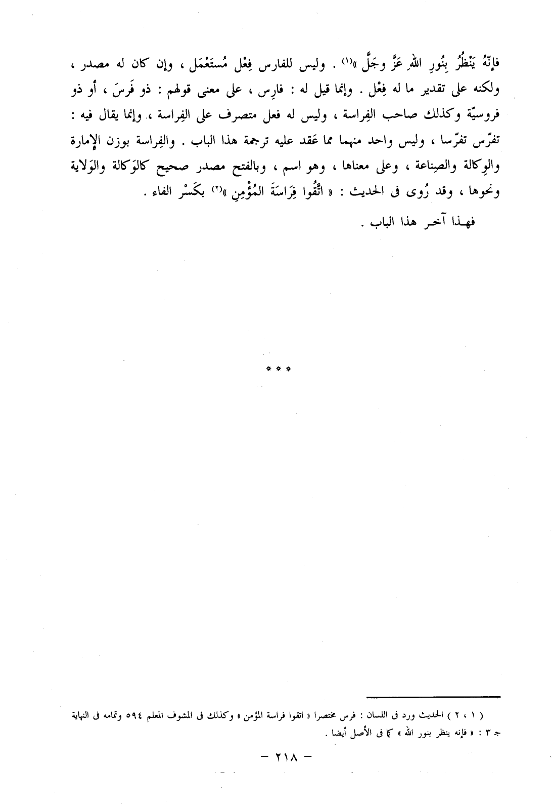 فإنه ينظر بنور الله عز وجل". وليس للفارس فعل مستعمل، وإن كان له مصدر، ولكنه على تقدير ما له فعل. وإنما قيل له: فارس، على معنى قولهم: ذو فرس، أو ذو فروسية وكذلك صاحب الفراسة، وليس له فعل متصرف على الفراسة، وإنما يقال فيه: تفرس تفرسا، وليس واحد منهما مما عقد عليه ترجمة هذا الباب. والفراسة بوزن الإمارة والوكالة والصناعة، وعلى معناها، وهو اسم، وبالفتح مصدر صحيح كالوكالة والولاية ونحوها، وقد روي في الحديث: "اتقوا فراسة المؤمن" بكسر الفاء.