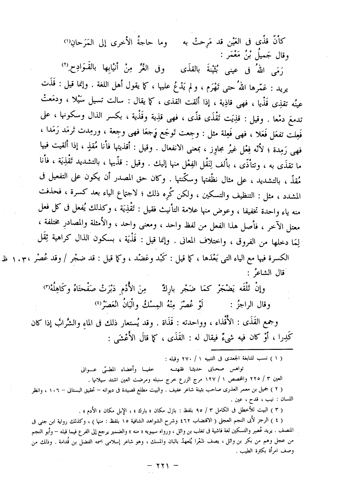 يريد: عمرها الله حتى تهرم، ولم يدع عليها، كما يقول أهل اللغة. وإنما قيل: قذت عينه تقذى قذيا، فهي قاذية، إذا ألقت القذى، كما يقال: سالت تسيل سيلا، ودمعت تدمع دمعا. وقيل: قذيت تقذى قذى، فهي قذِية وقذْية، بكسر الذال وسكونها، على فعلت تفعل فعلا، فهي فعلة مثل: وجعت توجع وجعا فهي وجعة، ورمدت ترمد رمدا، فهي رمدة؛ لنه فعل غير مجاوز، بمعنى الانفعال. وقيل: أقذيتها فأنا مقذ، إذا ألقيت فيها ما تقذى به، وتتأذى، بألف لنقل الفعل منها إليك. وقيل: قذيها، بالتشديد تقذية، فأنا مقذ، بالتشديد، على مثال نظفتها وسكنتها. وكان حق المصدر أن يكون على التفعيل في المشدد، مثل: التنظيف والتسكين، ولكن كره ذلك؛ لاجتماع الياء بعد كسرة، فحذفت منه ياء واحدة تخفيفا، وعوض منها علامة التأنيث فقيل: تقذية، وكذلك يفعل في كل فعل معتل الآخر، فأصل هذا الفعل من لفظ واحد، ومعنى واحد، والأمثلة والمصادر مختلفة، لما دخلها من الفروق، واختلاف المعاني. وإنما قيل: قذية، بسكون الذال كراهية ثقل الكسرة فيها مع الياء التي بعدها، كما قيل: كبد وعضد، وكما قيل: قد ضجر/ وقد عصر قال الشاعر: