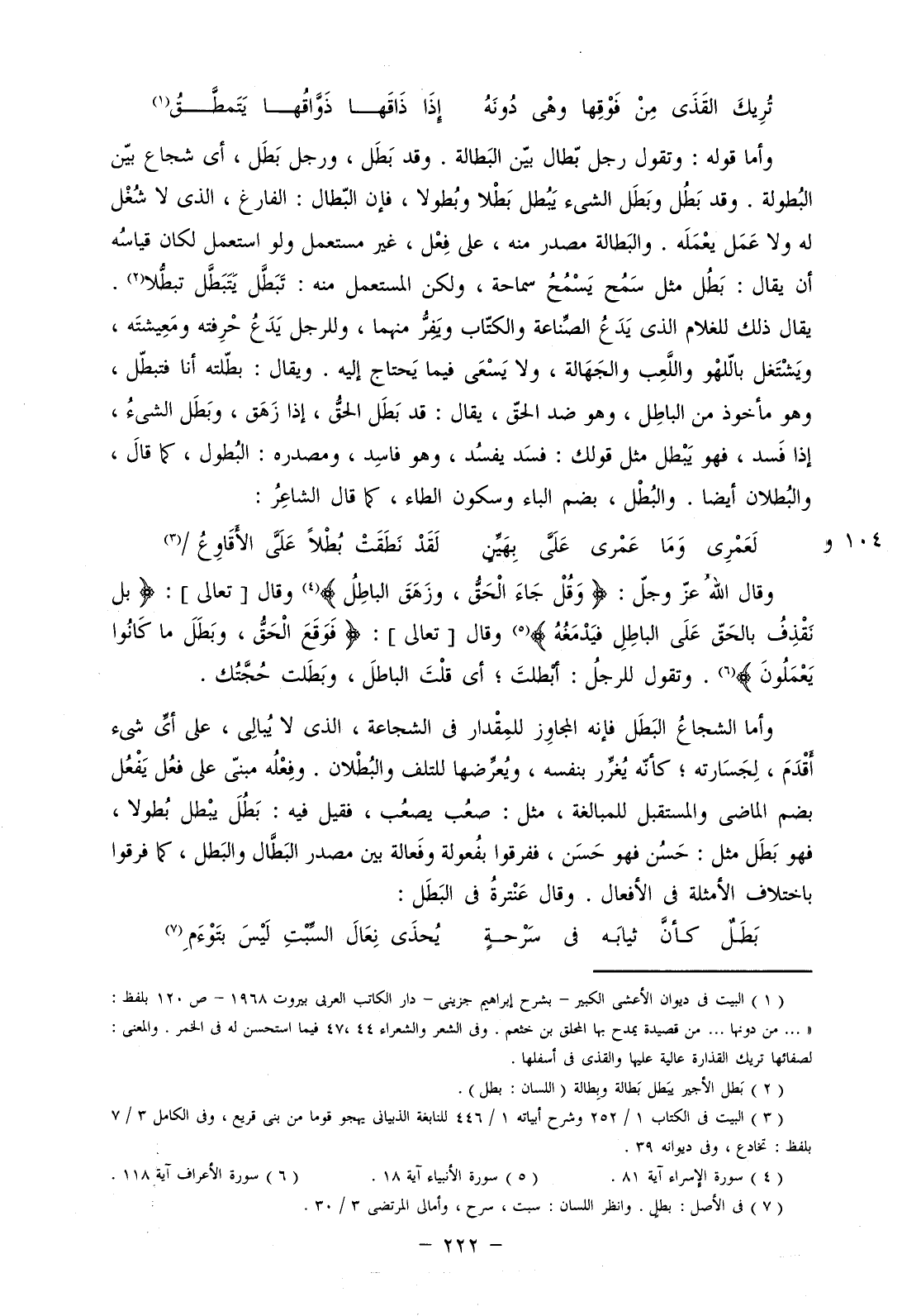 وأما قوله: وتقول رجل بطال بين البطالة. وقد بطل، ورجل بطل، أي شجاع بين البطولة. وقد بطل وبطل الشيء يبطل بطلا وبطولة، فإن البطال: الفارغ، الذي لا شغل له ولا عمل يعمله. والبطالة مصدر منه، على فعل، غير مستعمل ولو استعمل لكان قياسه أن يقال: بطل مثل سمح يسمح سماحة، ولكن المستعمل منه: تبطل يتبطل تبطلا. يقال ذلك للغلام الذي يدع الصناعة والكتاب ويفر منهما، وللرجل يدع حرفته ومعيشته، ويشتغل باللهو واللعب والجهالة، ولا يسعى فيما يحتاج إليه. ويقال: بطلته أنا فتبطل، وهو مأخوذ من الباطل، وهو ضد الحق، يقال: قد بطل الحق، إذا زهق، وبطل الشيء، إذا فسد، فهو يبطل مثل قولك: فسد يفسد، وهو فاسد، ومصدره: البطول، كما قال: والبطلان أيضا. والبطل، بضم الباء وسكون الطاء، كما قال الشاعر:
