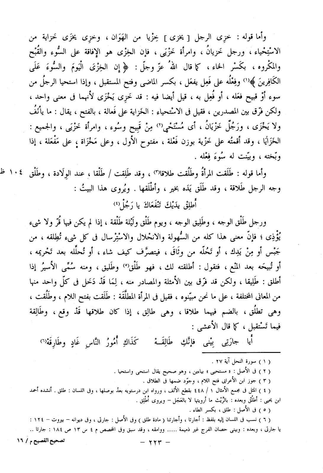 وأما قوله: طلقت المرأة وطلقت طلاقا، وقط طلقت/طلقا، عند الولادة، وطلق وجه الرجل طلاقة، وقد طلق يده بخير، وأطلقها. ويروى هذا البيت: