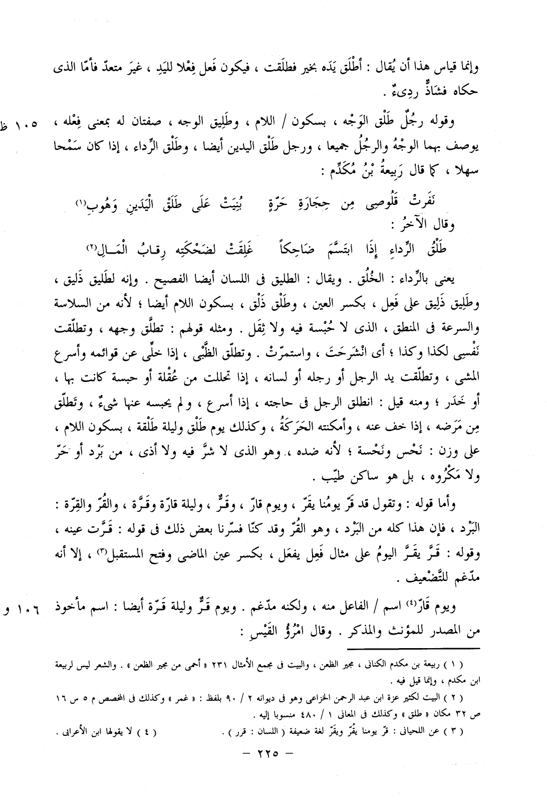 وقوله رجل طلق الوجه، بسكون/ اللام، وطليق الوجه، صفتان له بمعنى فعله، يوصف بهما الوجه والرجل جميعا، ورجل طلق اليدين أيضا، وطلق الرداء، إذا كان سمحا سهلا، كما قال ربيعة بن مكدم: