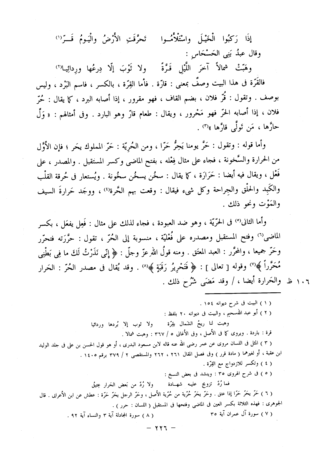 وأما الثاني في الحرية، وهو ضد العبودية، فجاء لذلك على مثال: فعل يفعل، بكسر الماضي وفتح المستقبل ومصدره على فعلية، منسوبة إلى الحر، تقول: حررته فتحرر وجر جميعا، والمحرر: العبد المعتق. ومنه قول الله عز وجل: (إنِّي نَذَرْتُ لَكَ مَا فِي بَطْنِي مُحَرَّرًا) وقوله [تعالى]: (فَتَحْرِيرُ رَقَبَةٍ). وقد يقال في مصدر الحر: الحرار والحرارة أيضا، / وقد مضى شرح ذلك.