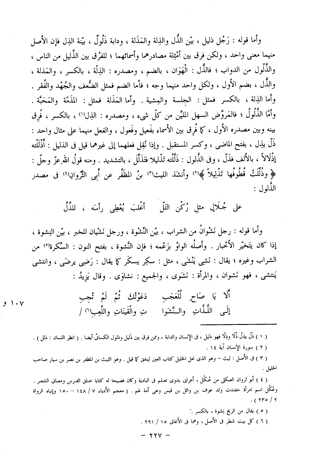 وأما قوله: رجل نشوان من الشراب، بين النشوة، ورجل نشيان للخبر، بين النشوة، إذا كان يتخير الأخبار. وأصله الواو بزعمه؛ فإن النشوة، بفتح النون: السكرة من الشراب وغيره؛ يقال: نشي ينشى، مثل: سكر يسكر كما يقال: رضي يرضى، وانتشى ينتشي، فهو نشوان، والمرأة: نشوى، والجميع: نشاوى. وقال يزيد: