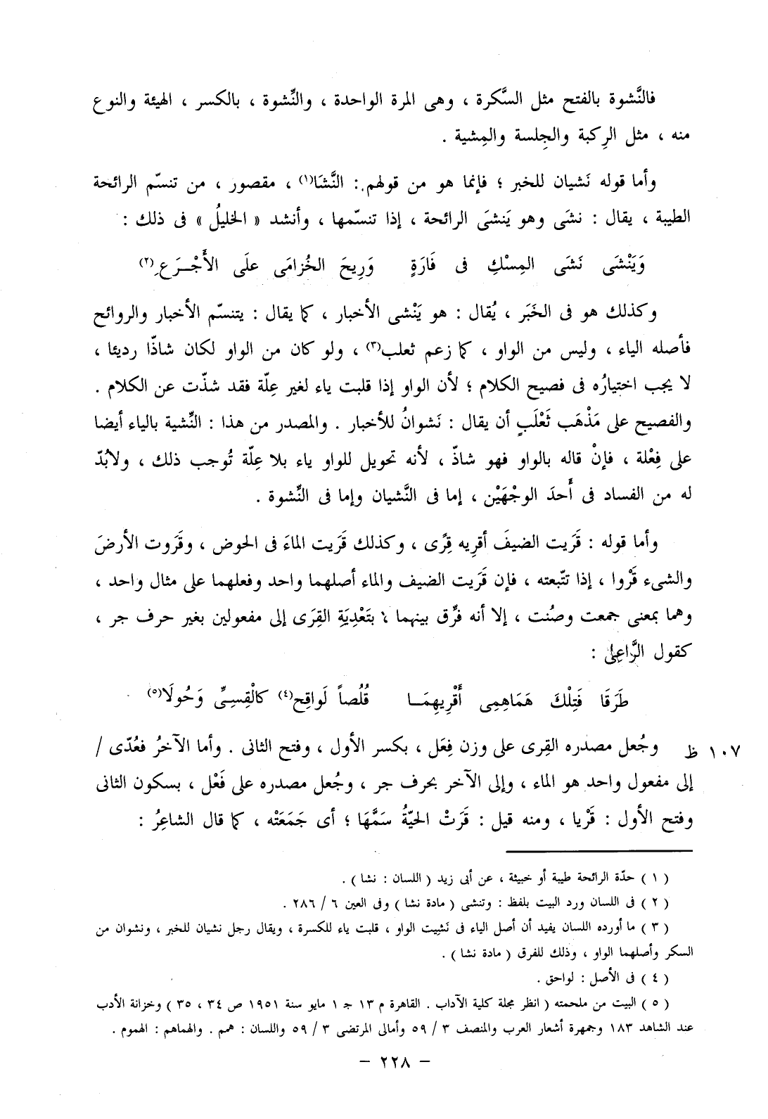 وأما قوله نشيان للخبر؛ فإنما هو من قولهم: النشا، مقصور، من تنسم الرائحة الطيبة، يقال: نشى وهو ينشى الرائحة، إذا تنسمها، وأنشد "الخليل" في ذلك: