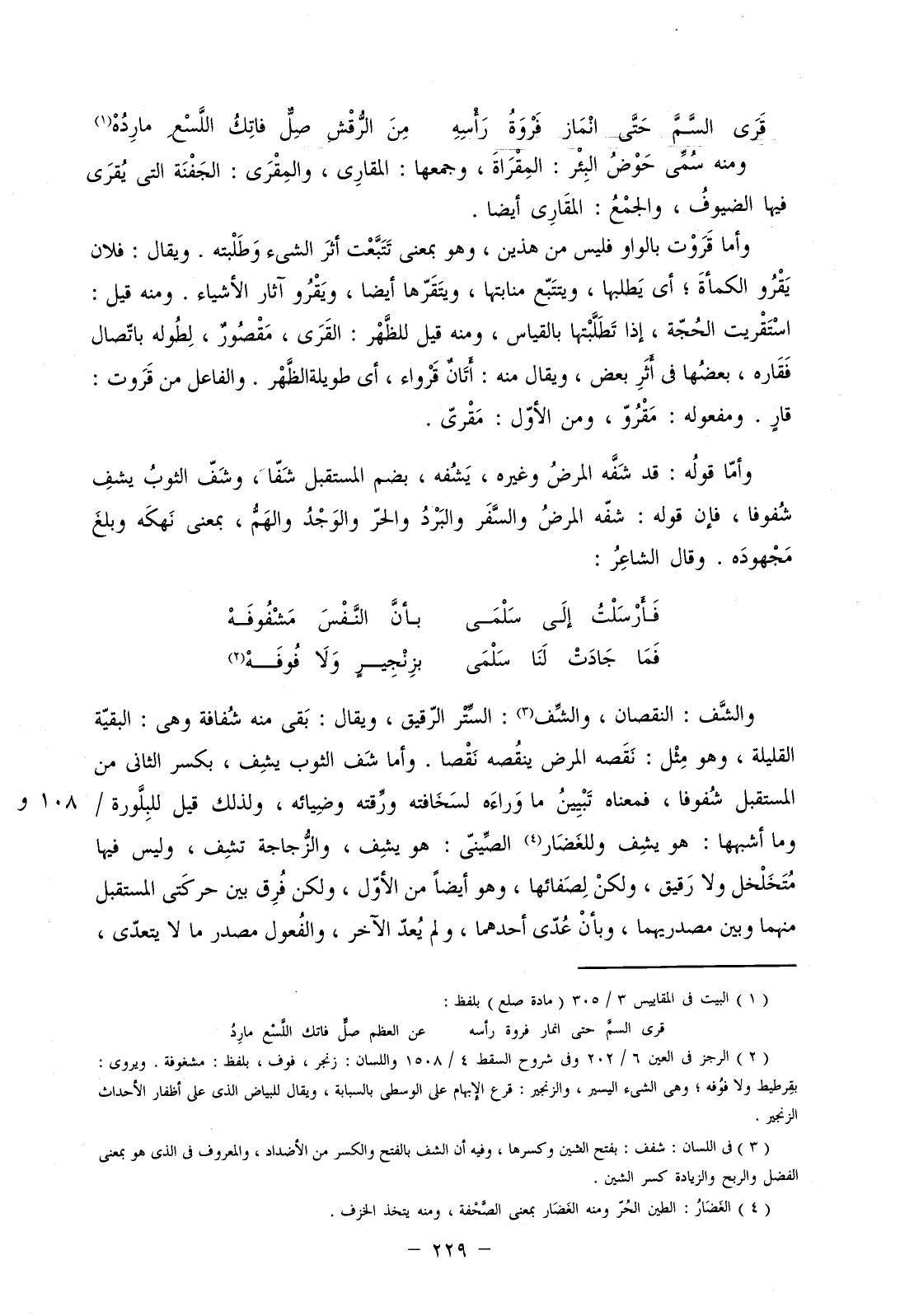 والشَّف: النقصان، والشِّف: الستر الرقيق، ويقال: بقي منه شفافة وهي: البقية القليلة، وهو مثل: نقص المرض ينفصه نقصا. وأما شف الثوب يشف، بكسر الثاني من المستقبل شفوفا، فمعناه تبيين ما وراءه لسخافته ورقته وضيائه، ولذلك قيل للبلورة/ وما أشبهها: هو يشف وللغضار الصيني: هو يشف، والزجاجة تشف، وليس فيها متخلخل ولا رقيق، ولكن لصفائها، وهو أيضا من الأول، ولكن فرق بين حركتي المستقبل منهما وبين مصدريهما، وبأن عدي أحدهما، ولم يعد الآخر، والفعول مصدر ما لا يتعدى،
