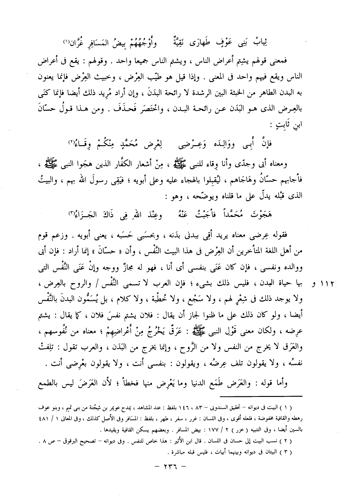 فقوله عرضي معناه يريد أقي ببدني بدنه، وبحسبي حسبه، يعني أبويه. وزعم قوم من أهل اللغة المتأخرين أن العرض في هذا البيت النفس، وأن "حسان" إنما أراد: فإن أبي ووالده ونفسي، فإن كان عنى بنفسي أي أنا، فهو له مجاز ووجه وإن عنى النفس التي بها حياة البدن، فليس ذلك بشيء؛ فإن العرب لا تسمي النفس/ والروح بالعرض، ولا يوجد ذلك في شعر لهم، ولا سجع، ولا خطبة، ولا كلام، بل يسمون البدن بالنفس أيضاً، ولو كان ذلك على ما ظنوا لجاز أن يقال: فلان يشتم نفس فلان، كما يقال: يشتم عرضه، ولكان معنى قول النبي صلى الله عليه وسلم: عرق يخرج من أعراضهم؛ معناه من نفوسهم، والعرق لا يخرج من النفس ولا من الروح، وإنما يخرج من البدن، والعرب تقول: تلقت نفسه، ولا يقولون تلف عرضه، ويقولون: بنفسي أنت، ولا يقولون بعرضي أنت.