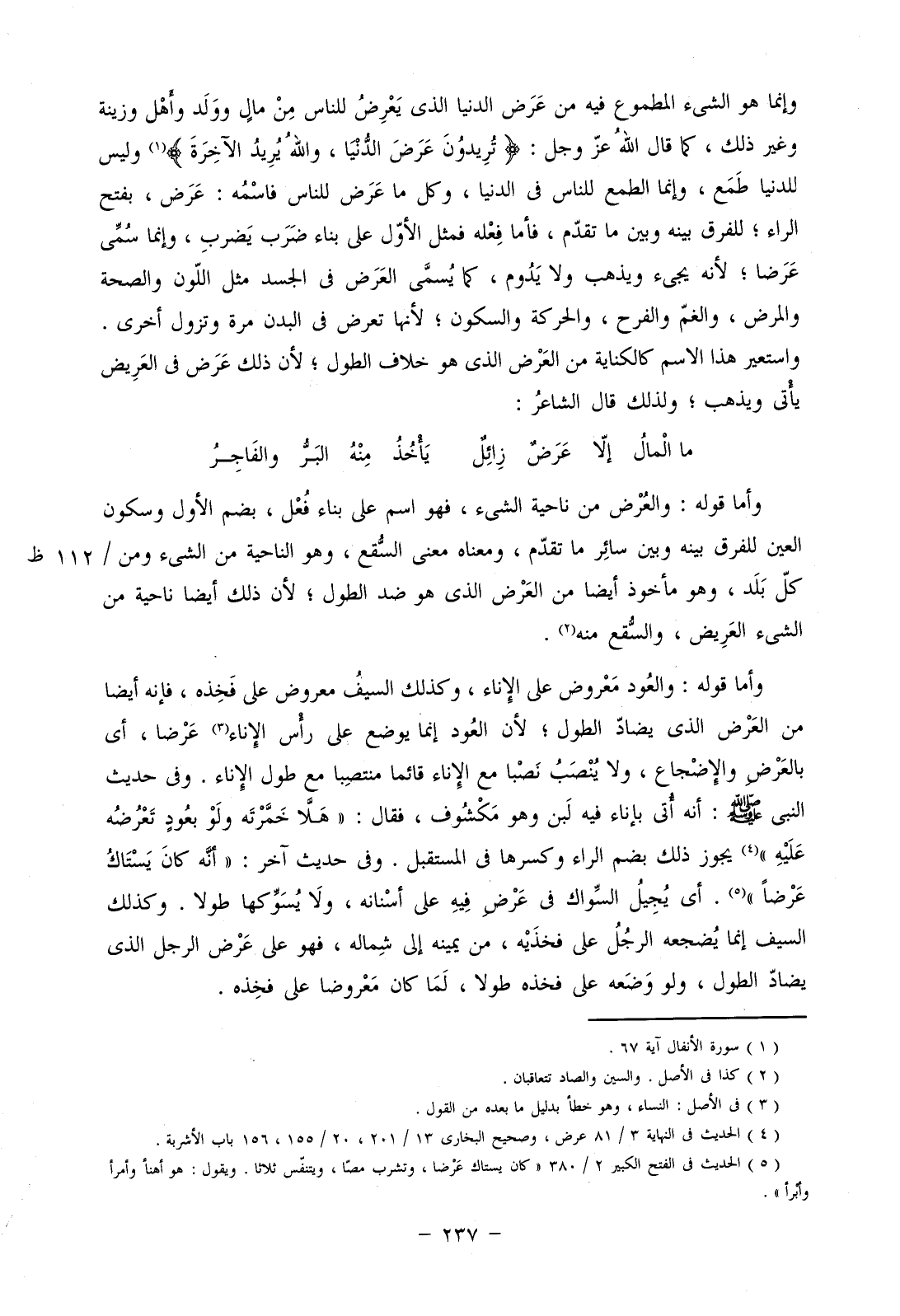 وإنما هو الشيء المطموع فيه من عرض الدنيا الذي يعرض للناس من مال وولد وأهل وزينة وغير ذلك، كما قال الله عز وجل: (تُرِيدُونَ عَرَضَ الدُّنْيَا واللَّهُ يُرِيدُ الآخِرَةَ) وليس للدنيا طمع، وإنما الطمع للناس في الدنيا، وكل ما عرض للناس فاسمه: عرض، بفتح الراء؛ للفرق بينه وبين ما تقدم، فأما فعله فمثل الأول على بناء ضرب يضرب، وإنما سمي عرضا؛ لأنه يجيء ويذهب ولا يدوم، كما يسمى العرض في الجسد مثل اللون والصحة والمرض، والغم والفرح، والحركة والسكون؛ لأنها تعرض في البدن مرة وتزول أخرى. واستعير هذا الاسم كالكناية من العرض الذي هو خلاف الطول؛ لأن ذلك عرض في العريض يأتي ويذهب؛ ولذلك قال الشاعر: