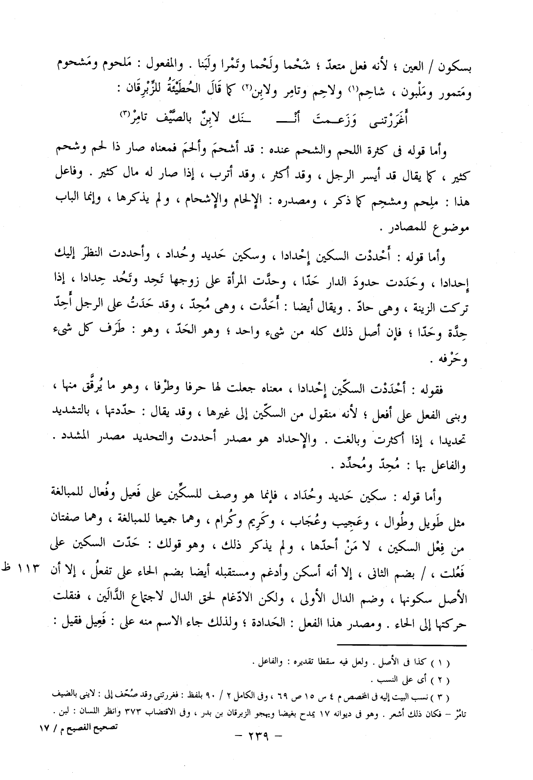 وأما قوله في كثرة اللحم والشحم عنده: قد أشحم وألحم فمعناه صار ذا لحم وشحم كثير، كما يقال قد أيسر الرجل، وقد أكثر، وقد أترب، إذا صار له مال كثير. وفاعل هذا: ملحم ومشحم كما ذكر، ومصدره: الإلحام والإشحام، ولم يذكرها، وإنما الباب موضوع للمصادر.
