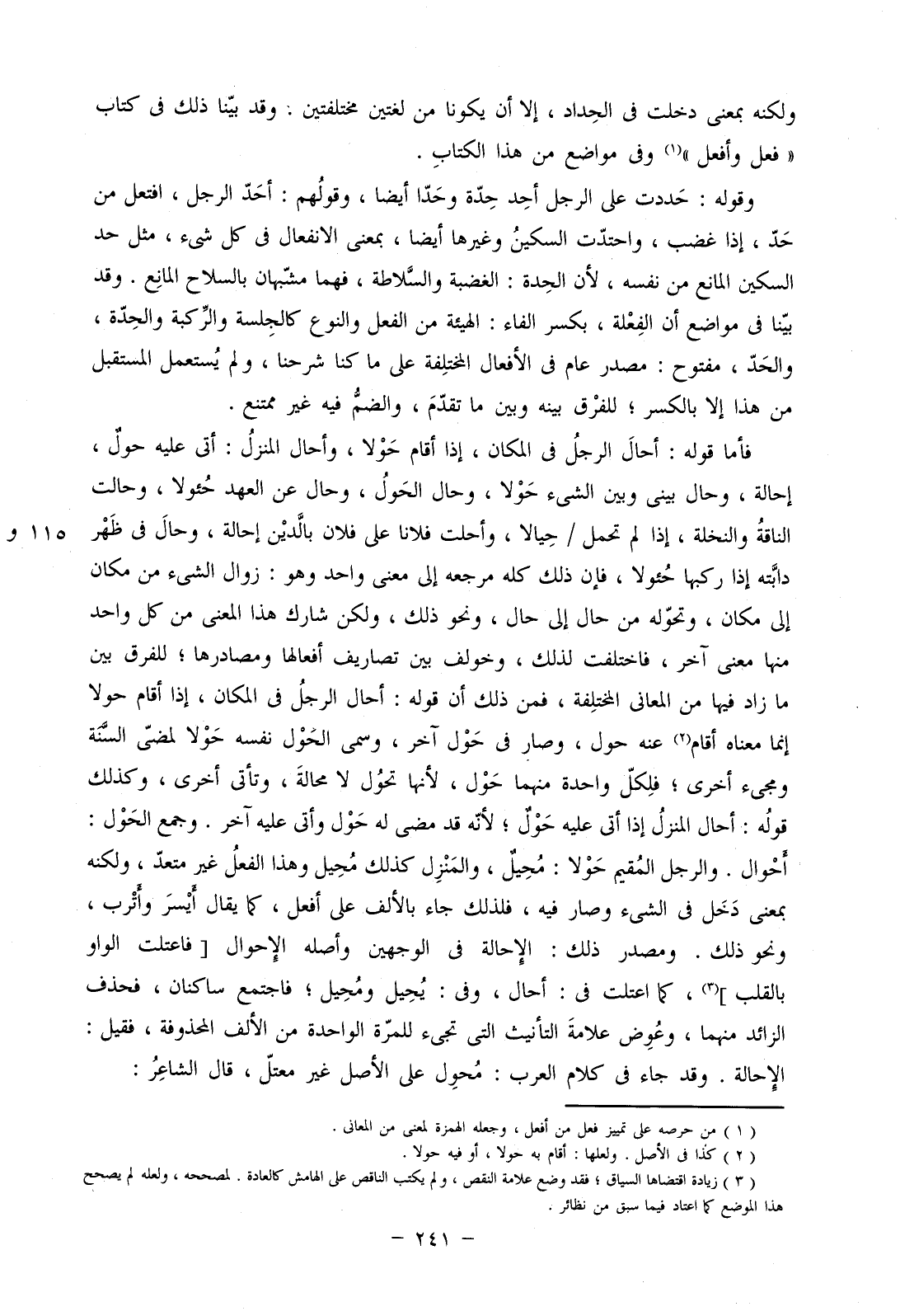 فأما قوله: أحال الرجل في المكان، إذا أقام حولا، وأحال المنزل: أتى عليه حول، إحالة، وحال بيني وبين الشيء حولا، وحال الحول، وحال عن العهد حئولا، وحالت الناقة والنخلة، إذا لم تحمل: حيالا، وأحلت فلانا على فلان بالدين إحالة، وحال في ظهر دابته إذا ركبها حئولا، فإن ذلك كله مرجعه إلى معنى واحد وهو: زوال الشيء من مكان إلى مكان، وتحوله من حال إلى حال، ونحو ذلك، ولكن شارك هذا المعنى من كل واحد منها معنى آخر، فاختلفت لذلك، وخولف بين تصاريف أفعالها ومصادرها؛ للفرق بين ما زاد فيها من المعاني المختلفة، فمن ذلك أن قوله: أحال الرجل في المكان، إذا أقام حولا إنما معناه أقام عنه حول، وصار في حول آخر، وسمي الحول نفسه حولا لمضي السنة ومجيء أخرى؛ فلكل واحدة منهما حول، لأنها تحول لا محالة، وتأتي أخرى، وكذلك قوله: أخال المنزل إذا أتى عليه حول؛ لأنه قد مضى له حول وأتى عليه آخر. وجمع الحول: أحوال. والرجل المقيم حولا: محيل، والمنزل كذلك محيل وهذا الفعل غير متعد، ولكنه بمعنى دخل في الشيء وصار فيه، فلذلك جاء بالألف على أفعل، كما يقال ايسر وأترب، ونحو ذلك. ومصدر ذلك: الإحالة في الوجهين وأصله الإحوال [فاعتلت الواو بالقلب]، كما اعتلت في: أحال، وفي: يحيل ومحيل؛ فاجتمع ساكنان، فحذف الزائد منهما، وعوض علامة التأنيث التي تجيء للمرة الواحدة من الألف المحذوفة، فقيل: الإحالة. وقد جاء في كلام العرب: محول على الأصل غير معتل، قال الشاعر: