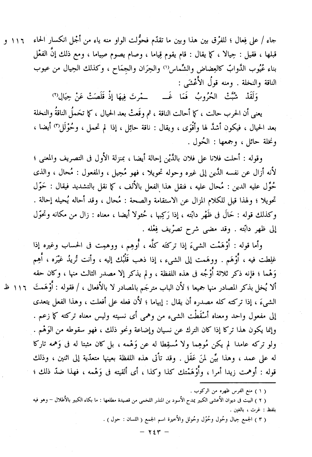 جاء/ على فعال؛ للفرق بين هذا وبين ما تقدم فحولت الواو منه ياء من أجل انكسار الحاء قبلها، فقيل: حيالا، كما يقال: قام يقوم قياما، وصام يصوم صياما، ومع ذلك إن الفعل بناء عيوب الدواب كالعضاض والشماس والحران والجماح، وكذلك الحيال من عيوب الناقة والنخلة. ومنه قول الأعشى: