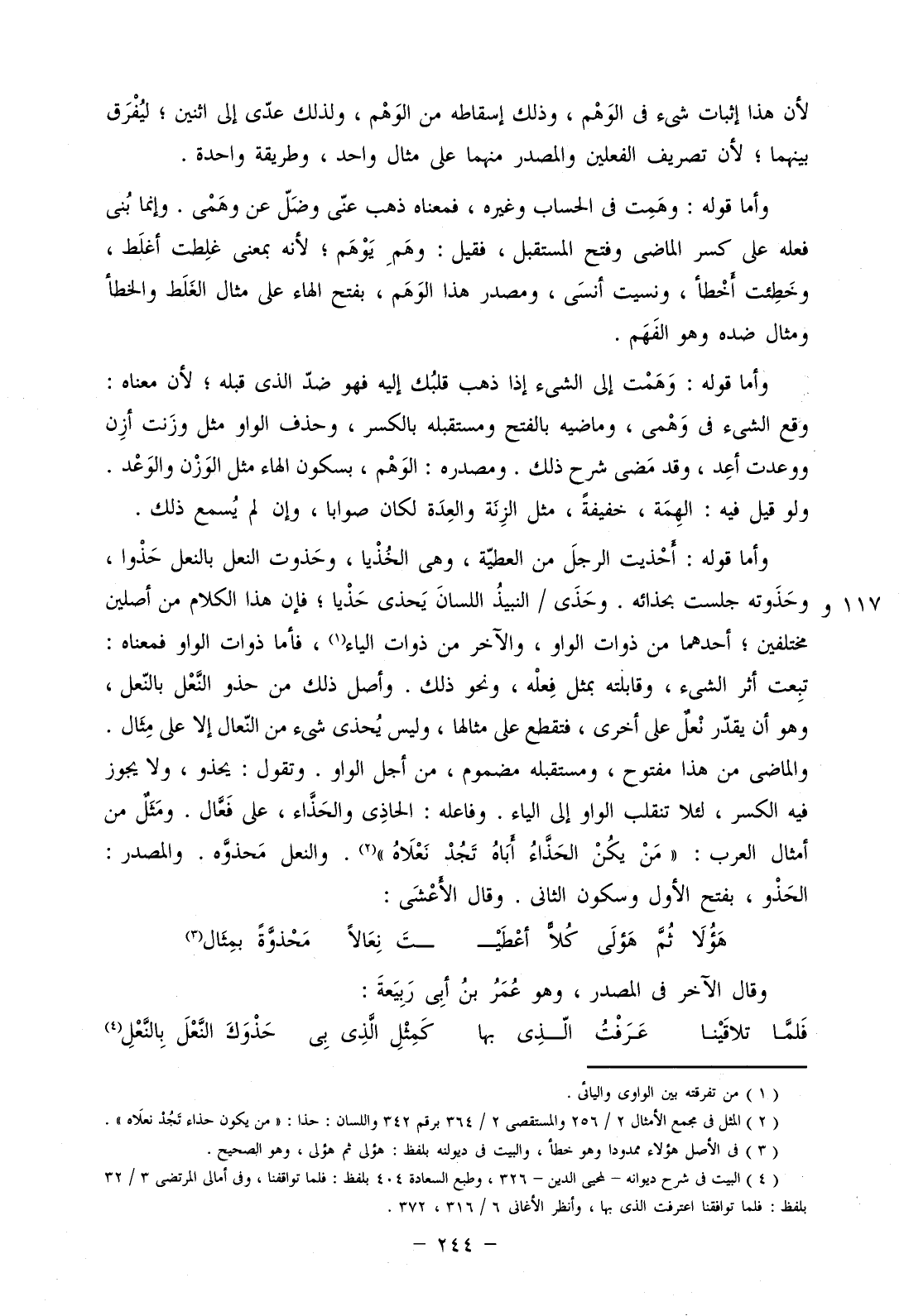 وأما قوله: وهمت إلى الشيء إذا ذهب قلبك إليه فهو ضد الذي قبله؛ لأن معناه: وقع الشيء في وهمي، وماضيه بالفتح ومستقبله بالكسر، وحذف الواو مثل وزنت أزن ووعدت أعد، وقد مضى شرح ذلك. ومصدره: الوهم، بسكون الهاء مثل الوزن والوعد. ولو قيل فيه: الهمة، خفيفة، مثل الزنة والعدة لكان صوابا، وإن لم يسمع ذلك.