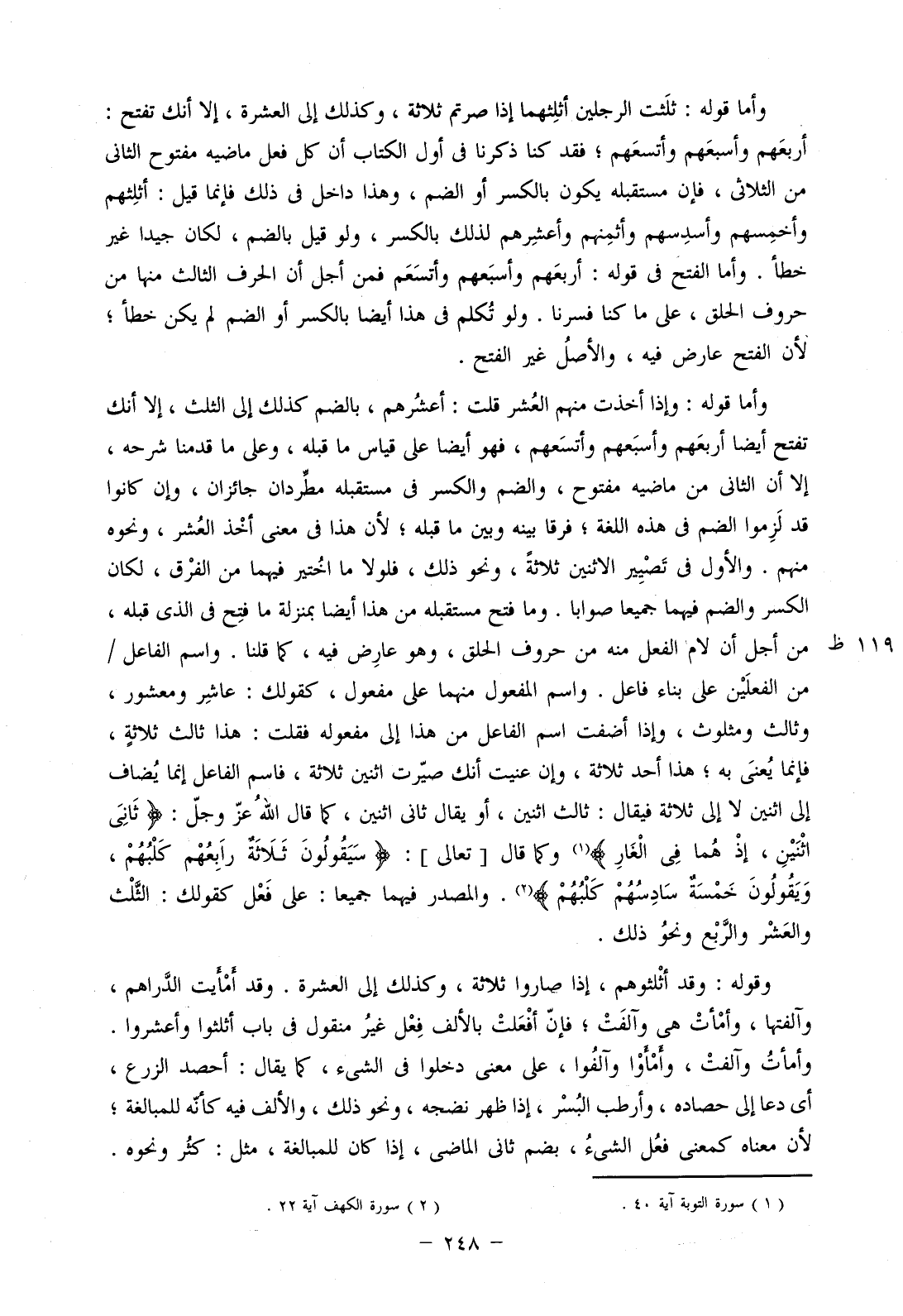 وأما قوله: وإذا أخذت منهم العشر قلت: أعشرهم، بالضم كذلك إلى الثلث، إلا أنك تفتح أيضا أربعهم وأسبعهم وأتسعهم، فهو أيضا على قياس ما قبله، وعلى ما قدمنا شرحه، إلا أن الثاني من ماضيه مفتوح، والضم والكسر في مستقبله مطردان جائزان، وإن كانوا قد لزموا الضم في هذه اللغة؛ فرقا بينه وبين ما قبله؛ لأن هذا في معنى أخذ العشر، ونحوه منهم. والأول في تصيير الاثنين ثلاثة، ونحو ذلك، فلولا ما اختير فيهما من الفرق، لكان الكسر والضم فيهما جميعا صوابا. وما فتح مستقبله من هذا ايضا بمنزلة ما فتح في الذي قبله، من أجل أن لام الفعل منه منحروف الحلق، وهو عارض فيه، كما قلنا. واسم الفاعل/ من الفعلين على بناء فاعل. واسم المفعول منهما على مفعول، كقولك: عاشر ومعشور، وثالث ومثلوث، وإذا أضفت اسم الفاعل منهذا إلى مفعوله فقلت: هذا ثالث ثلاثة، فإنما يعنى به؛ هذا أحد ثلاثة، وإن عنيت أنك صيرت اثنين ثلاثة، فاسم الفاعل إنما يضاف إلى اثنين لا إلى ثلاثة فيقال: ثالث اثنين، أو يقال ثاني اثنين، كما قال الله عز وجل: (ثَانِيَ اثْنَيْنِ إذْ هُمَا فِي الغَارِ) وكما قال [تعالى]: (سَيَقُولُونَ ثَلاثَةٌ رَّابِعُهُمْ كَلْبُهُمْ ويَقُولُونَ خَمْسَةٌ سَادِسُهُمْ كَلْبُهُمْ). والمصدر فيهما جميعا: على فعل كقولك: الثلث والعشر والربع ونحو ذلك.