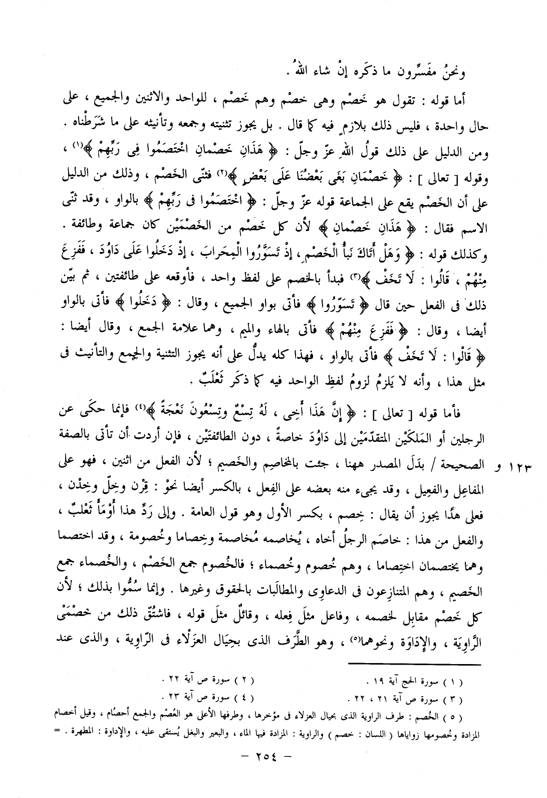 أما قوله: تقول هو خصم وهي خصم وهم خصم، للواحد والاثنين والجميع، على حال واحدة، فليس ذلك بلازم فيه كما قال. بل يجوز تثنيته وجمعه وتأنيه على ما شرطناه. ومن الدليل على ذلك قول الله عز وجل: (هَذَانِ خَصْمَانِ اخْتَصَمُوا فِي رَبِّهِمْ)، وقوله [تعالى]: (خَصْمَانِ بَغَى بَعْضُنَا عَلَى بَعْضٍ) فثنى الخصم، وذلك من الدليل على أن الخصم يقع على الجماعة قوله عز وجل: (اخْتَصَمُوا فِي رَبِّهِمْ) بالواو، وقد ثنى الاسم فقال: (هَذَانِ خَصْمَانِ) لأن كل خصم من الخصمين كان جماعة وطائفة. وكذلك قوله: (وهَلْ أَتَاكَ نَبَأُ الخَصْمِ إذْ تَسَوَّرُوا المِحْرَابَ (21) إذْ دَخَلُوا عَلَى دَاوُودَ فَفَزِعَ مِنْهُمْ قَالُوا لا تَخَفْ) فبدأ بالخصم على لفظ واحد، فأوقعه على طائفتين، ثم بين ذلك في الفعل حين قال (تَسَوَّرُوا) فأتى بواو الجميع، وقال: (دَخَلُوا) فأتى بالواو أيضا، وقال: (فَفَزِعَ مِنْهُمْ) فأتى بالهاء والميم، وهما علامة الجمع، وقال أيضا: (قَالُوا لا تَخَفْ) فأتى بالواو، فهذا كله يدل على أنه يجوز التثنية والجمع والتأنيث في مثل هذا، وأنه لا يلزم لزوم لفظ الواحد فيه كما ذكر ثعلب.