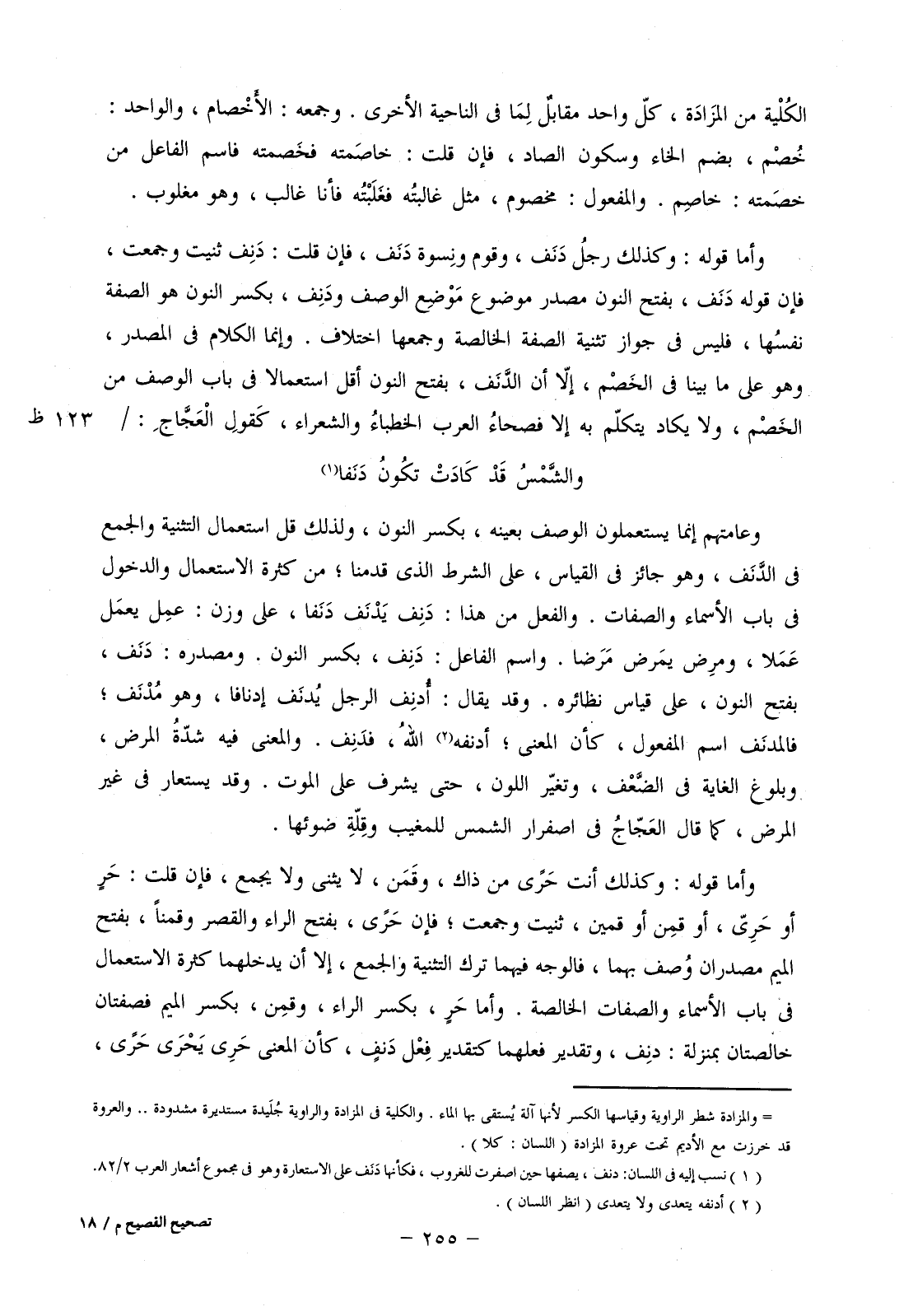 وعامتهم إنما يستعملون الوصف بعينه، بكسر النون، ولذلك قل استعمال التثنية والجمع في الدنف، وهو جائز في القياس، على الشرط الذي قدمنا؛ من كثرة الاستعمال والدخول في باب الأسماء والصفات. والفعل من هذا: دنف يدنف دنفا، على وزن: عمل يعمل عملا، ومرض يمرض مرضا. واسم الفاعل: دنف، بكسر النون. ومصدره: دنف، بفتح النون، على قياس نظائره. وقد يقال: أدنف الرجل يدنف إدنافا، وهو مدنف؛ فالمدنف اسم المفعول، كأن المعنى؛ أدنفه الله، فدنف. والمعنى فيه شدة المرض، وبلوغ الغاية في الضعف، وتغير اللون، حتى يشرف على الموت. وقد يستعار في غير المرض، كما قال العجاج في اصفرار الشمس للمغيب وقلة ضوئها.