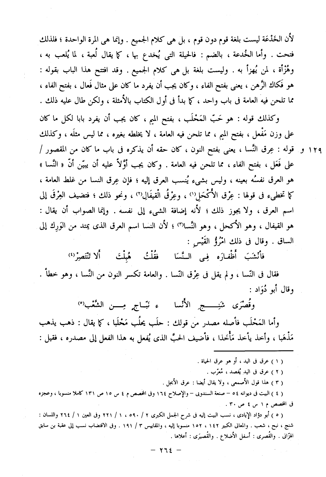 وكذلك قوله: هو حب المحلب، بفتح الميم، كان يجب أن يرفد بابا لكل ما كان على وزن مفعل، بفتح الميم، مما تلحن فيه العامة، لا يخلطه بغيره، مما ليس مثله، وكذلك قوله: عرق النسا، يعني بفتح النون، كان حقه أن يذكره في باب ما كان من المقصور/ على فعل، بفتح الفاء، مما تلحن فيه العامة. وكان يجب أولا عليه أن يبين أن "النسا" هو العرق نفسه بعينه، وليس بشيء ينسب العرق إليه؛ فإن عرق النسا من غلط العامة، كما تخطئ في قولها: عرق الأكحل، وعرق القيفال، ونحو ذلك؛ فتضيف العرق إلى اسم العرق، ولا يجوز ذلك؛ لأنه إضافة الشيء إلى نفسه. وإنما الصواب أن يقال: هو القيفال، وهو الأكحل، وهو النسا؛ لأن النسا اسم العرق الذي يمتد من الورك إلى الساق. وقال في ذلك امرؤ القيس:
