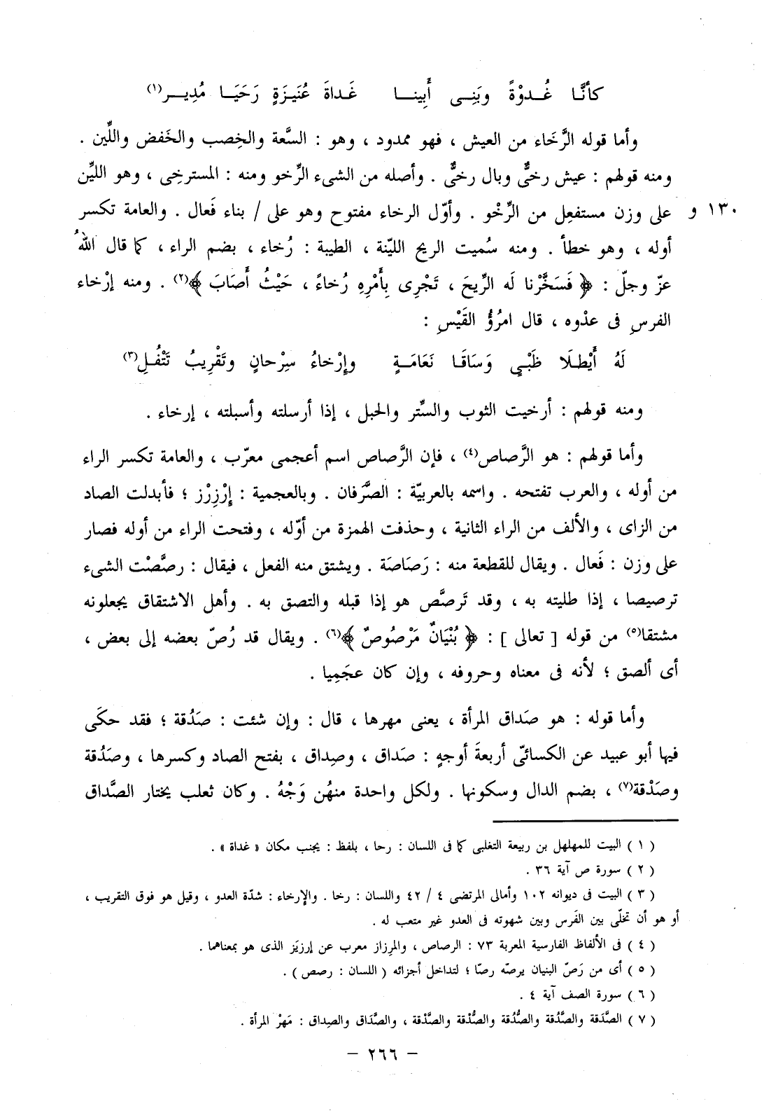 وأما قولهم: هو الرصاص، فإن الرصاص اسم أعجمي معرب، والعامة تكسر الراء من أوله، والعرب تفتحه. واسمه بالعربية: الصرفان. وبالعجمية: إرزرز؛ فأبدلت الصاد من الزاي، والألف من الراء الثانية، وحذفت الهمزة من أوله، وفتحت الراء من أوله فصار على وزن: فعال. ويقال للقطعة منه: رصاصة. ويشتق منه الفعل، فيقال: رصصت الشيء ترصيص، إذا طليته به، وقد ترصص هو إذا قبله والتصق به. وأهل الاشتقاق يجعلونه مشتقا من قوله [تعالى]: (بُنْيَانٌ مَّرْصُوصٌ). ويقال قد رص بعضه إلى بعض، أي ألصق؛ لأنه في معناه وحروفه، وإن كان عجميا.