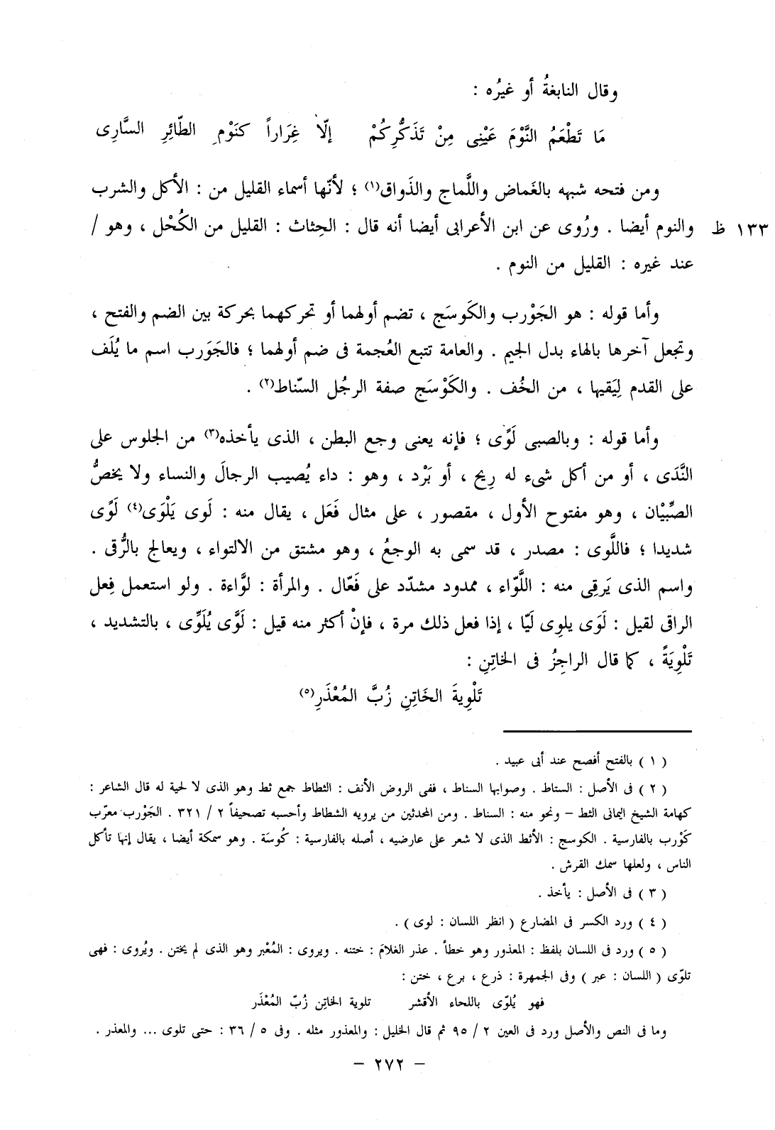 وأما قوله: وبالصبي لوى؛ فإنه يعنى وجع البطن، الذي يأخذه من الجلوس على الندى، أو من كل شيء له ريح، أو برد، وهو: داء يصيب الرجال والنساء ولا يخص الصبيان، وهو مفتوح الأول، مقصور، على مثال فعل، يقال منه: لوى يلوي لوى شديدا؛ فاللوى: مصدر، قد سمي به الوجع، وهو مشتق من الالتواء، ويعالج بالرقي. واسم الذي يرقي منه: اللواء، ممدود مشدد على فعال. والمرأة: لواءة. ولو استعمل فعل الراقي لقيل: لوى يلوي ليا، إذا فعل ذلك مرة، فإن أكثر منه قيل: لوى يلوي، بالتشديد، تلوية، كما قال الراجز في الخاتن: