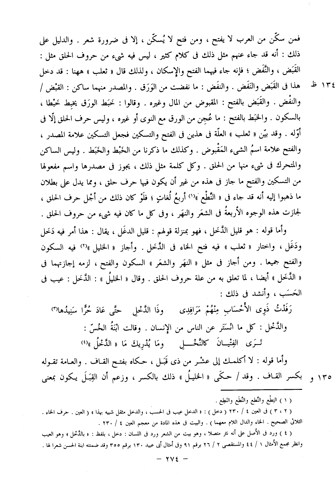 فمن سكن من العرب لا يفتح، ومن فتح لا يسكن، إلا في ضرورة شعر. والدليل على ذلك: أنه قد جاء عنهم مثل ذلك في كلام كثير، ليس فيه شيء من حروف الحلق مثل: القبض، والنفض؛ فإنه جاء فيهما الفتح والإسكان، ولذلك قال "ثعلب" ههنا: قد دخل هذا في القبض والنفض. والنفض: ما نفضت من الورق. والمصدر منهما ساكن: القبض/ والنفض. والقبض بالفتح: المقبوض من المال وغيره. وقالوا: خبط الورق يخبط خبطا، بالسكون. والخبط بالفتح: ما عجن من الورق مع النوى أو غيره، وليس حرف الحلق إلا في أوله. وقد بين "ثعلب" العلة في هذين في الفتح والتسكين فجعل التسكين علامة المصدر، والفتح علامة اسم الشيء المقبوض. وكذلك ما ذكرنا من الخَبْط والخَبَط. وليس الساكن والمتحرك في شيء منها من الحلق. وكل كلمة مثل ذلك، يجوز في مصدرها واسم مفعولها من التسكين والفتح ما جاز في هذه من غير أن يكون فيها حرف حلق، ومما يدل على بطلان ما ذهبوا إليه أنه قد جاء في "النطع" أربع لغات؛ فلو كان ذلك من أجل حرف الحلق، لجازت هذه الوجوه الأربعة في الشعر والنهر، وفي كل ما كان فيه شيء من حروف الحلق.