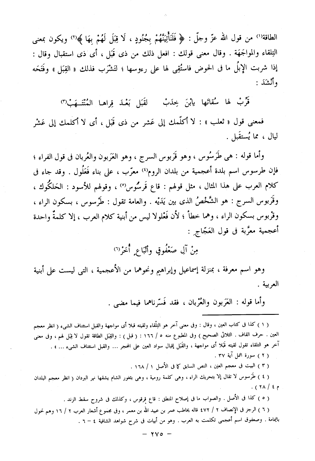 وأما قوله: هي طرسوس، وهو قربوس السرج، وهو العربون والعربان في قول الفراء؛ فإن طرسوس اسم بلدة أعجمية من بلدان الروم معرب، على بناء فعلول. وقد جاء في كلام العرب على هذا المثال، مثل قولهم: قاع قرسوس، وقولهم للأسود: الحلكوك، وقربوس السرج: هو الشخص الذي بين يديه. والعامة تقول: طرسوس، بسكون الراء، وقربوس بسكون الراء، وهما خطأ؛ لأن فعلولا ليس من أبنية كلام العرب، إلا كلمة واحدة أعجمية معربة في قول العجاج:
