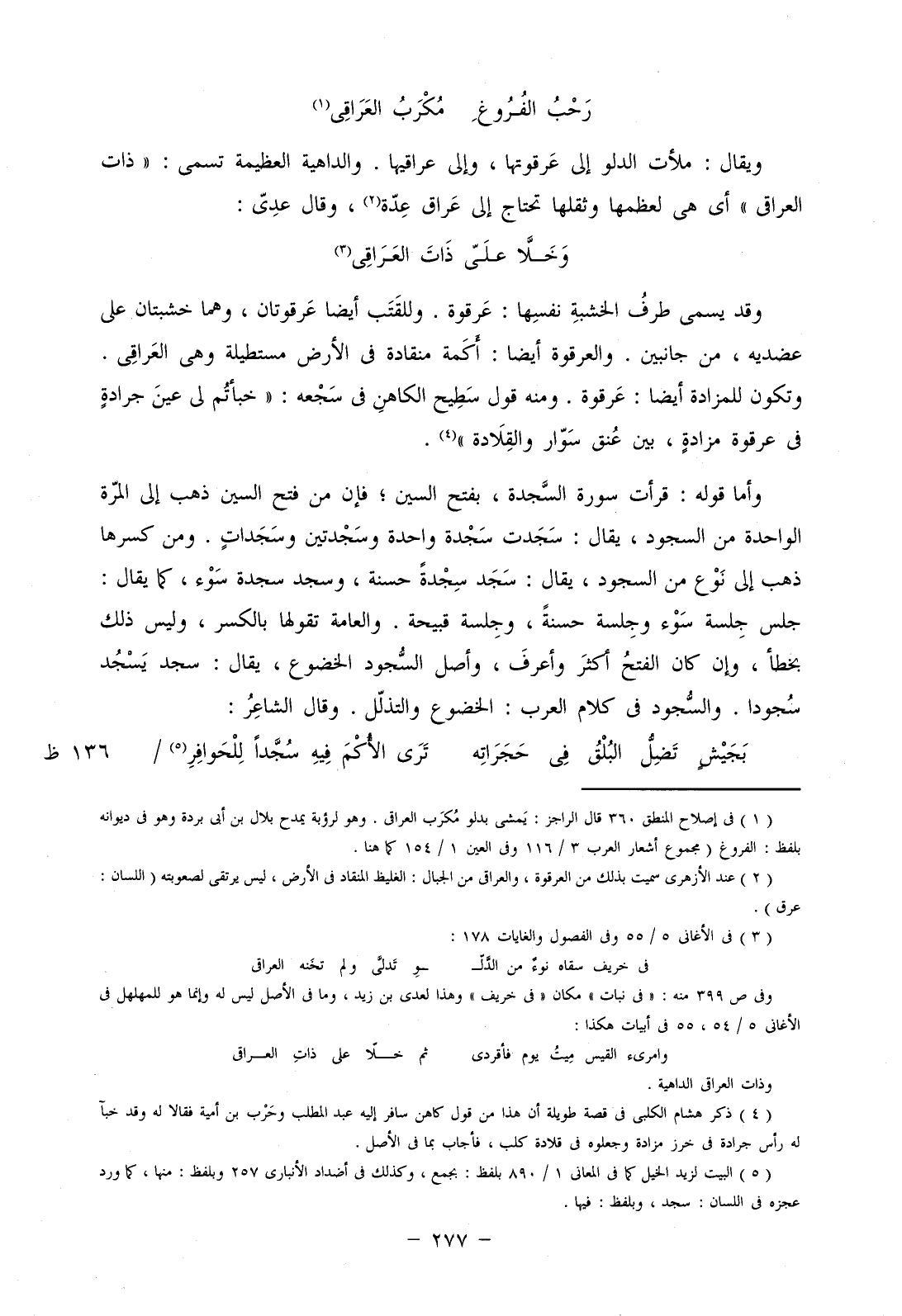 ويقال: ملأت الدلو إلى عرقوتها، وإلى عراقيها. والداهية العظيمة تسمى: "ذات العراقي" أي هي لعظمها وثقلها تحتاج إلى عراق عدة، وقال عدي: