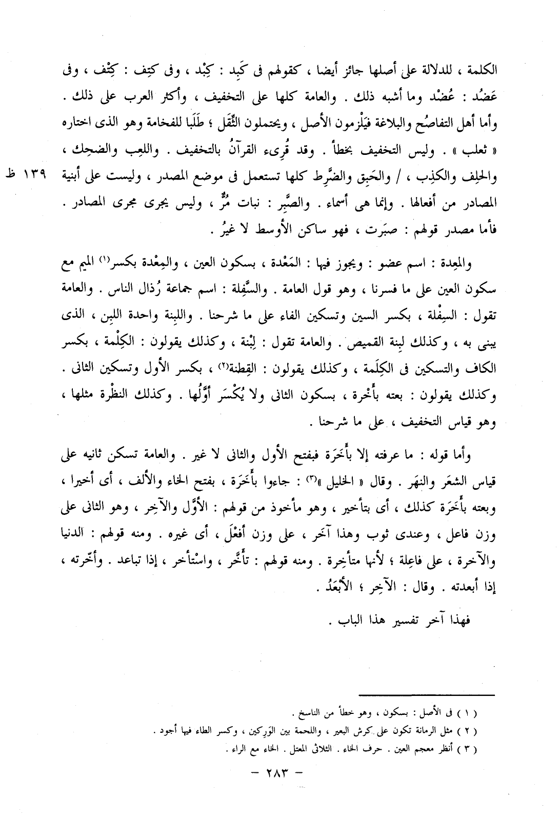 الكلمة، للدلالة على أصلها جائز أيضا، كقولهم في كبد: كبد، وفي كتف: كتف، وفي عضد: عضد وما أشبه ذلك. والعامة كلها على التخفيف، وأكثر العرب على ذلك. وأما أهل التفاصح والبلاغة فيلزمون الأصل، ويحتملون الثقل؛ طلبا للفخامة وهو الذي اختاره "ثعلب". وليس التخفيف بخطأ. وقد قرئ القرآن بالتخفيف. واللعب والضحك، والحلف والكذب، / والحبق والضرط كلها تستعمل في موضع المصدر، وليست على أبنية المصادر من أفعالها. وإنما هي أسماء. والصبر: نبات مر، وليس يجري مجرى المصادر. فأما مصدر قولهم: صبرت، فهو ساكن الأوسط لا غير.