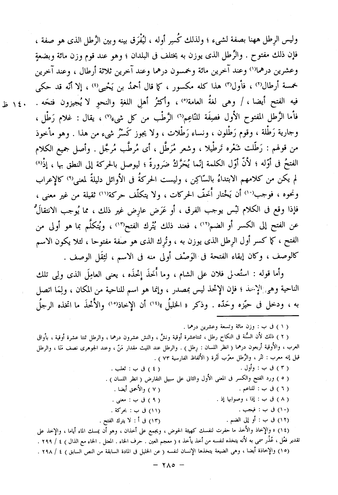 وليس الرطل ههنا بصفة لشيء؛ ولذلك كسر أوله، ليفرق بينه وبين الرطل الذي هو صفة، فإن ذلك مفتوح. والرطل الذي يوزن به يختلف في البلدان؛ وهو عند قوم وزن مائة وبضعة وعشرين درهما وعند آخرين مائة وخمسون درهما وعند آخرين ثلاثة أرطال، وعند آخرين خمسة أرطال، فأول هذا كله مكسور، كما قال أحمد بن يحيى، إلا أنه قد حكي فيه الفتح أيضا،/ وهي لغة العامة، وأكثر أهل اللغة والنحو لا يجيزون فتحه. فأما الرطل المفتوح الأول فصفة للناعم الرطب من كل شيء، يقال: غلام رطل، وجارية رطلة، وقوم رطلون، ونساء رطلات، ولا يجوز كسر شيء من هذا. وهو مأخوذ من قولهم: رطلت شعره ترطيلا، وشعر مرطل، أي مرطب مرجل. وأصل جميع الكلام الفتح في أوله؛ لأن أول الكلمة إنما يحرك ضرورة؛ يوصل بالحركة إلى النطق بها، إذ لم يكن من كلامهم الابتداء بالساكن، وليست الحركة في الأوائل دليلة لمعنى كالإعراب ونحوه، فوجب أن يختار أخف الحركات، ولا يتكلف حركة ثقيلة من غير معنى، فإذا وقع في الكلام لبس يوجب الفرق، أو عرض عارض غير ذلك، مما يوجب الانتقال عن الفتح إلى الكسر أو الضم، فعند ذلك يترك الفتح، ويتكلم بما هو أولى من الفتح، كما كسر أول الرطل الذي يوزن به، وترك الذي هو صفة مفتوحا، لشلا يكون الاسم كالوصف، وكان إبقاء الفتحة في الوصف أولى منه في الاسم، لثقل الوصف.
