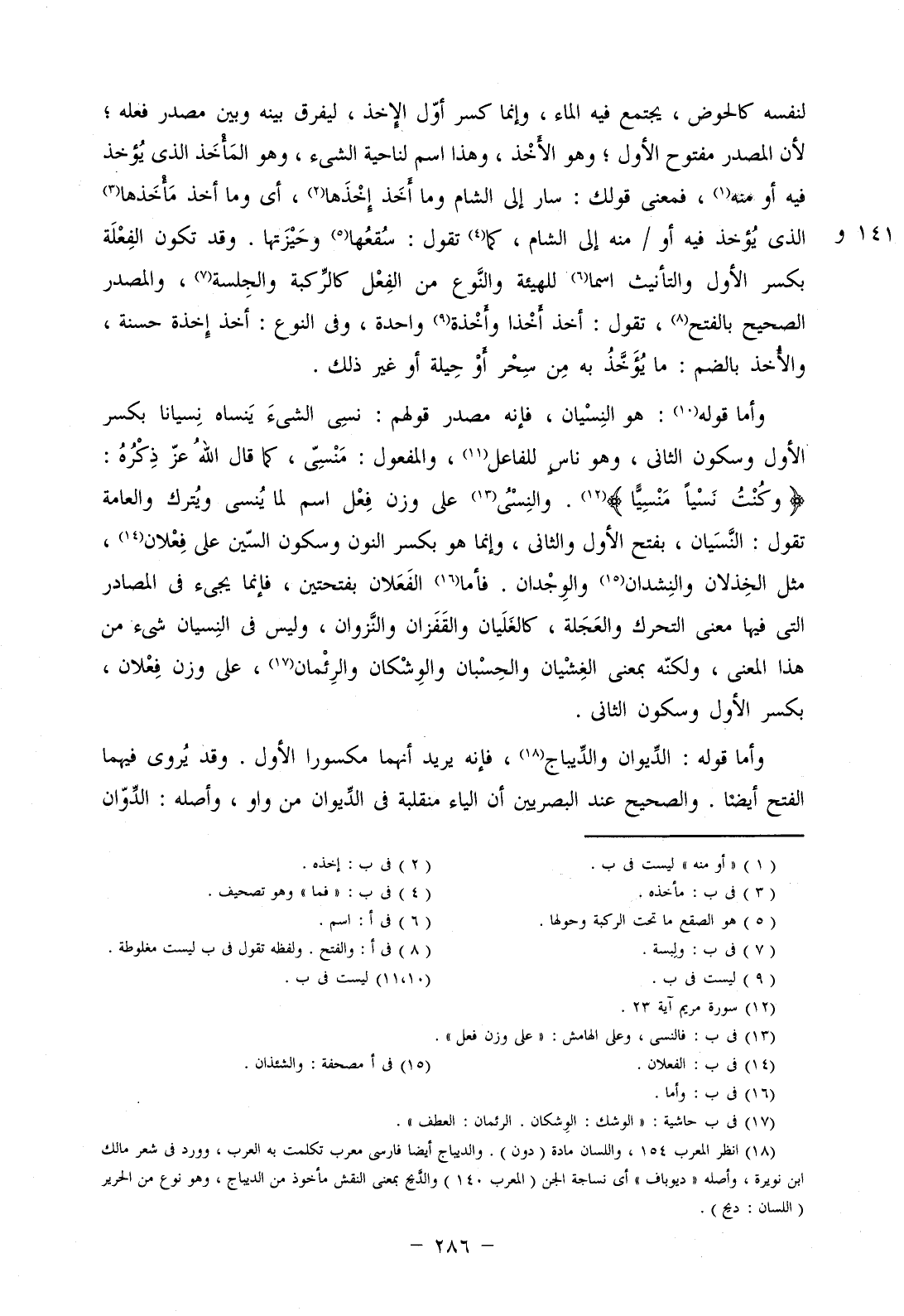 وأما قوله: هو النسيان، فإنه مصدر قولهم: نسي الشيء ينساه نسيانا بكسر الأول وسكون الثاني، وهو ناس للفاعل، والمفعول: منسي، كما قال الله عز ذكره: (وكُنتُ نَسْيًا مَّنسِيًا). والنسي على وزن فعل اسم لما ينسى ويترك والعامة تقول: النسيان، بفتح الأول والثاني، وإنما هو بكسر النون وسكون السين على فعلان، مثل الخذلان والنشدان والوجدان. فأما الفعلان بفتحتين، فإنما يجيء في المصادر التي فيها معنى التحرك والعجلة، كالغليان والقفزان والنزوان، وليس في النسيان شيء من هذا المعنى، ولكنه بمعنى الغشيان والحسبان والوشكان والرئمان، على وزن فعلان، بكسر الأول وسكون الثاني.