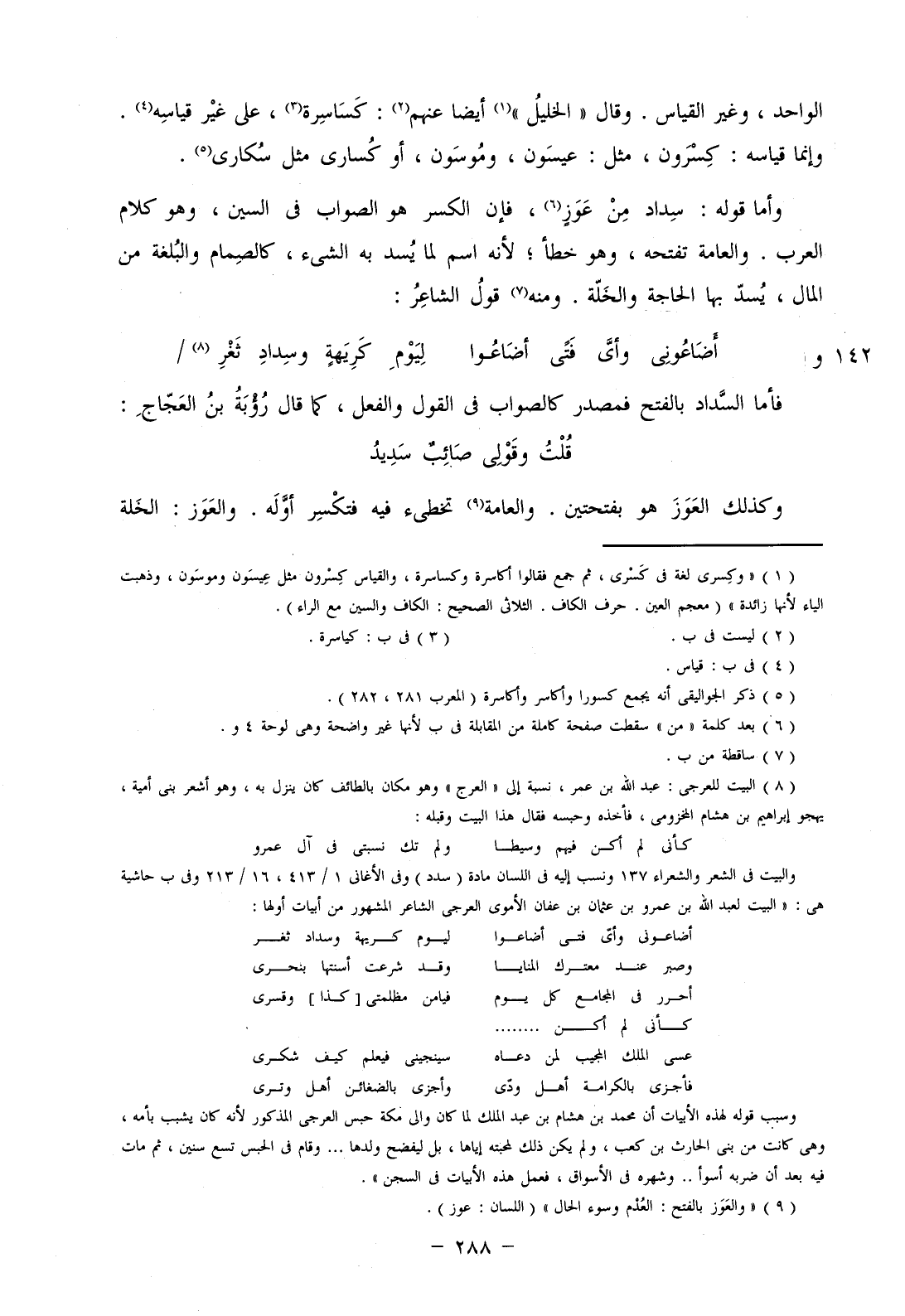 وأما قوله: سداد منعوز، فإن الكسر هو الصواب في السين، وهو كلام العرب. والعامة تفتحه، وهو خطأ؛ لأنه اسم لما يسد به الشيء، كالصمام والبلغة من المال، يسد بها الحاجة والخلة. ومنه قول الشاعر: