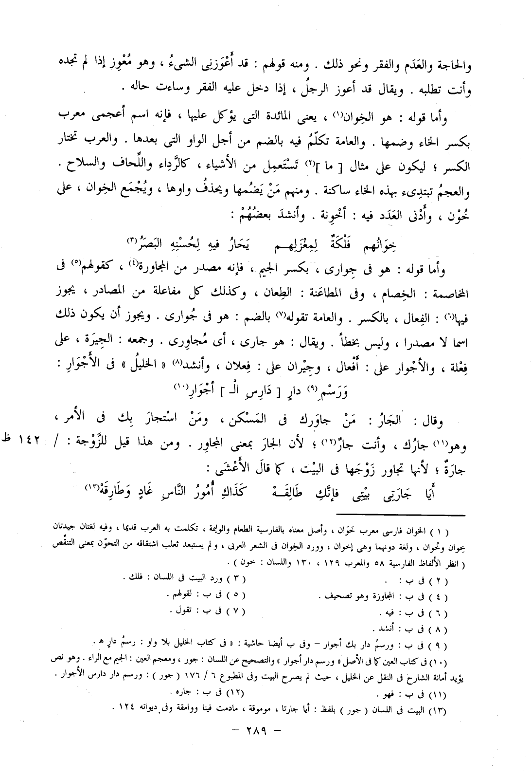 وقال: الجار: من جاورك في المسكن، ومن استجار بك في الأمر، وهو جارك، وأنت جار؛ لأن الجار بمعنى المجاور. ومن هذا قيل للزوجة:/ جارة؛ لأنها تجاور زوجها في البيت، كما قال الأعشى: